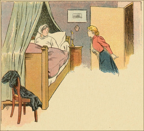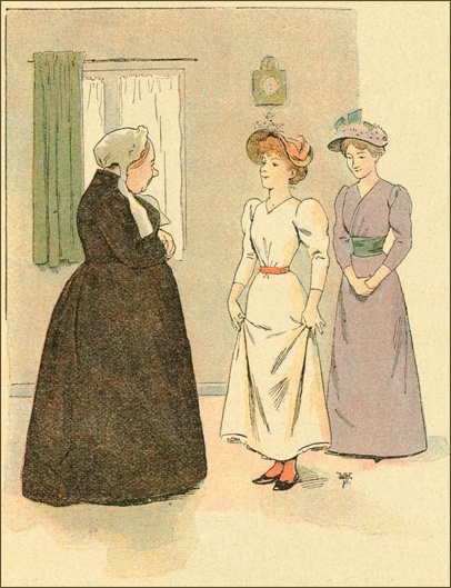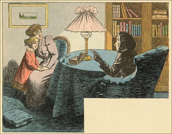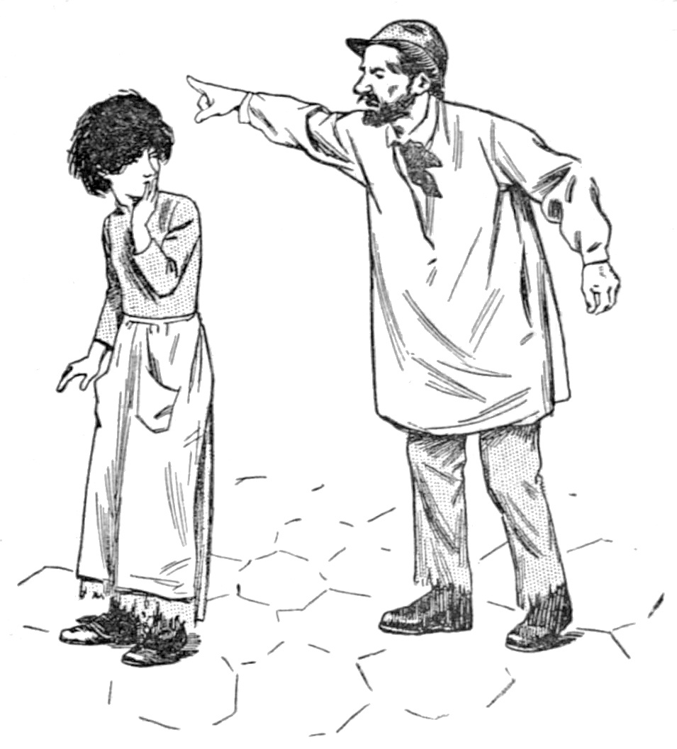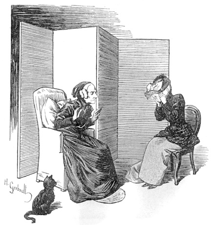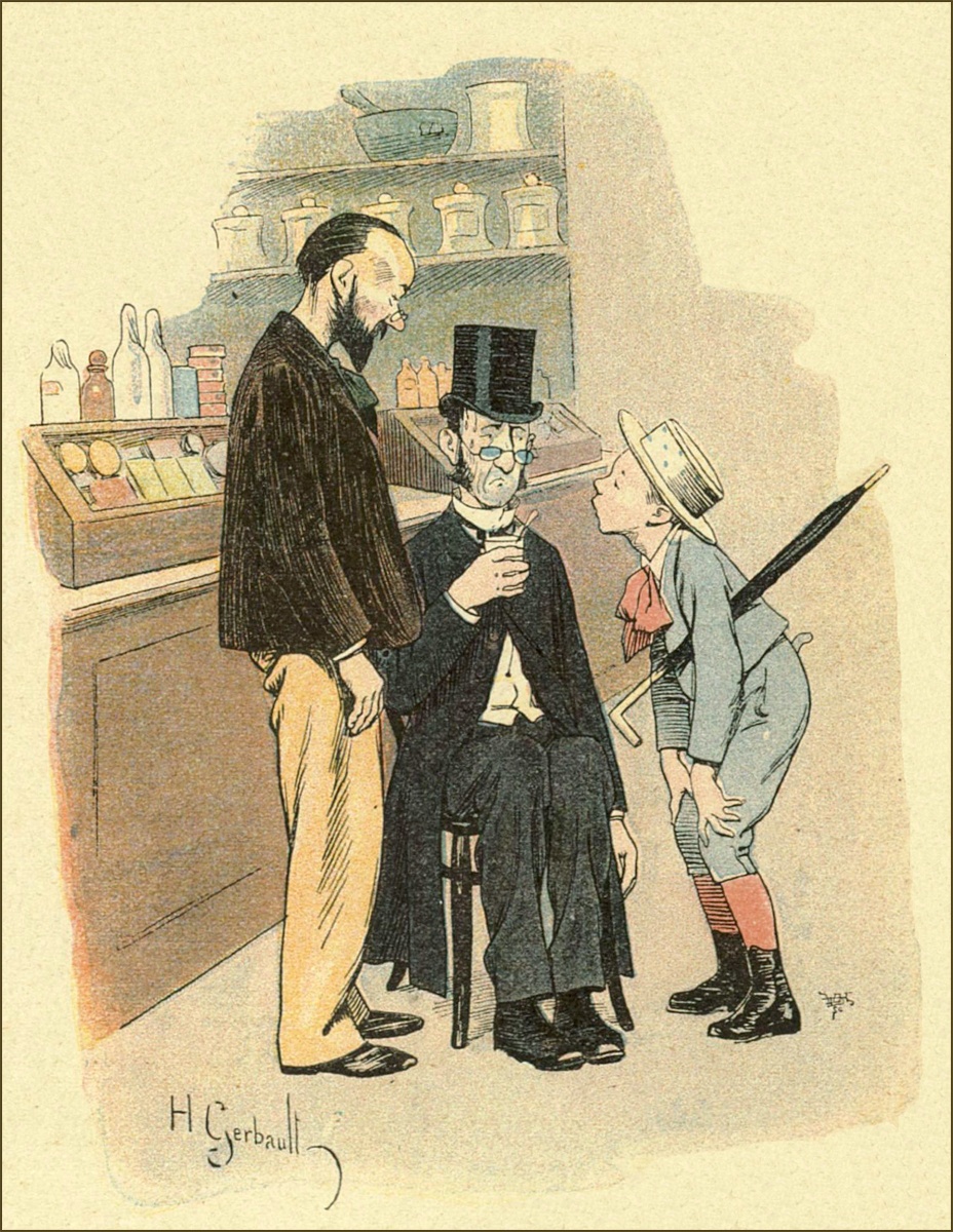 Un jour, comme Mme Rossignol était occupée dans son arrière-boutique, je vis entrer dans le magasin une dame et une petite fille d’une douzaine d’années, et, tandis que la sonnette retentissante de la porte prévenait la marchande, les deux étrangères échangeaient le dialogue suivant: