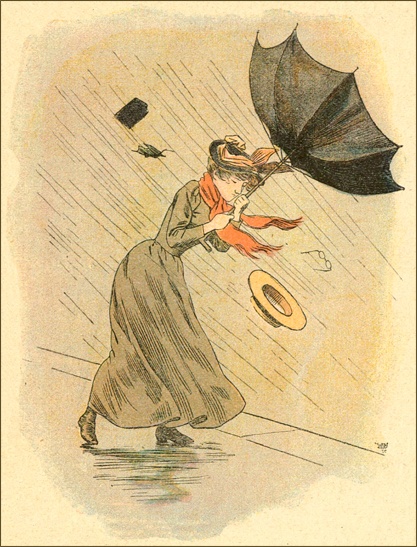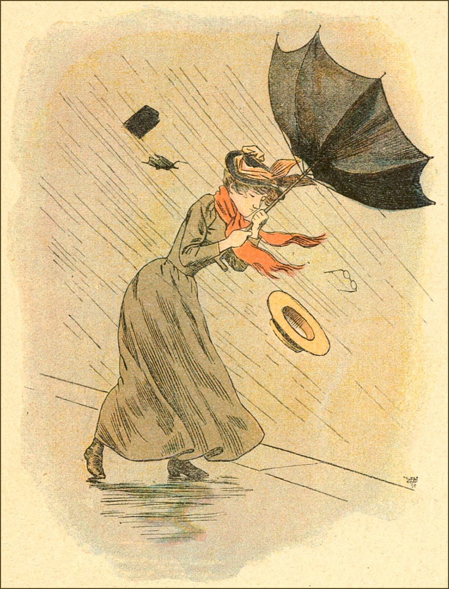 Malgré les récits peu encourageants des vieux parapluies, j’avais hâte d’en sortir et de me déployer au grand air, tant le mouvement et la liberté ont d’attraits pour la jeunesse. En vain, ma chère ombrelle bleue, plus sage ou plus timide, essayait de calmer mon ardeur: