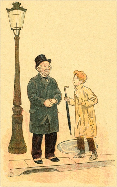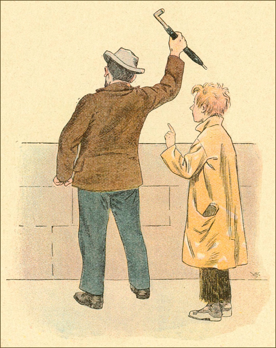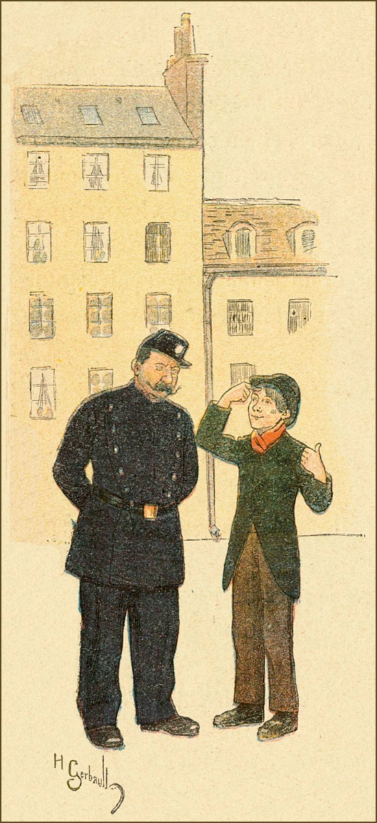 D’un regard moqueur et curieux, le jeune garçon le poursuivit un instant, puis, abordant un sergent de ville, il lui dit d’un air important: