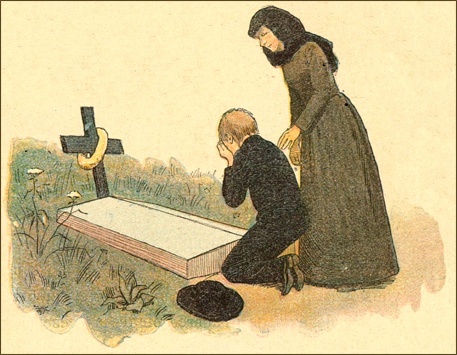 Maintenant un modeste convoi, l’enterrement du pauvre dans toute sa simplicité, se présente à sa vue. Derrière le cercueil, seulement deux personnes, deux en tout: une vieille femme qui a mis un fichu noir sur sa tête pour la circonstance, mais qui, évidemment, n’est pas en deuil, et un jeune garçon d’une quinzaine d’années qui sanglote, le visage caché dans un mouchoir de couleur. Quoiqu’il ait une veste noire au lieu de sa blouse 56 bleue, M. Dufour s’écrie: «Ce doit être lui!» Et, ému, intéressé, il suit de loin l’humble cortège et va se poster derrière un monument, tout près de la tombe béante.