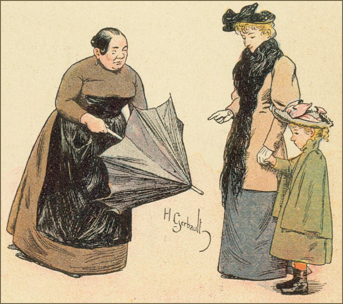 «Voici ce que j’ai de mieux en fait de parapluie, dit-elle. Voyez plutôt: le manche est charmant, la monture bien finie et la soie croisée parfaitement souple; or, vous ne l’ignorez pas, Madame, ces soies souples ne se coupent pas, comme les autres.»