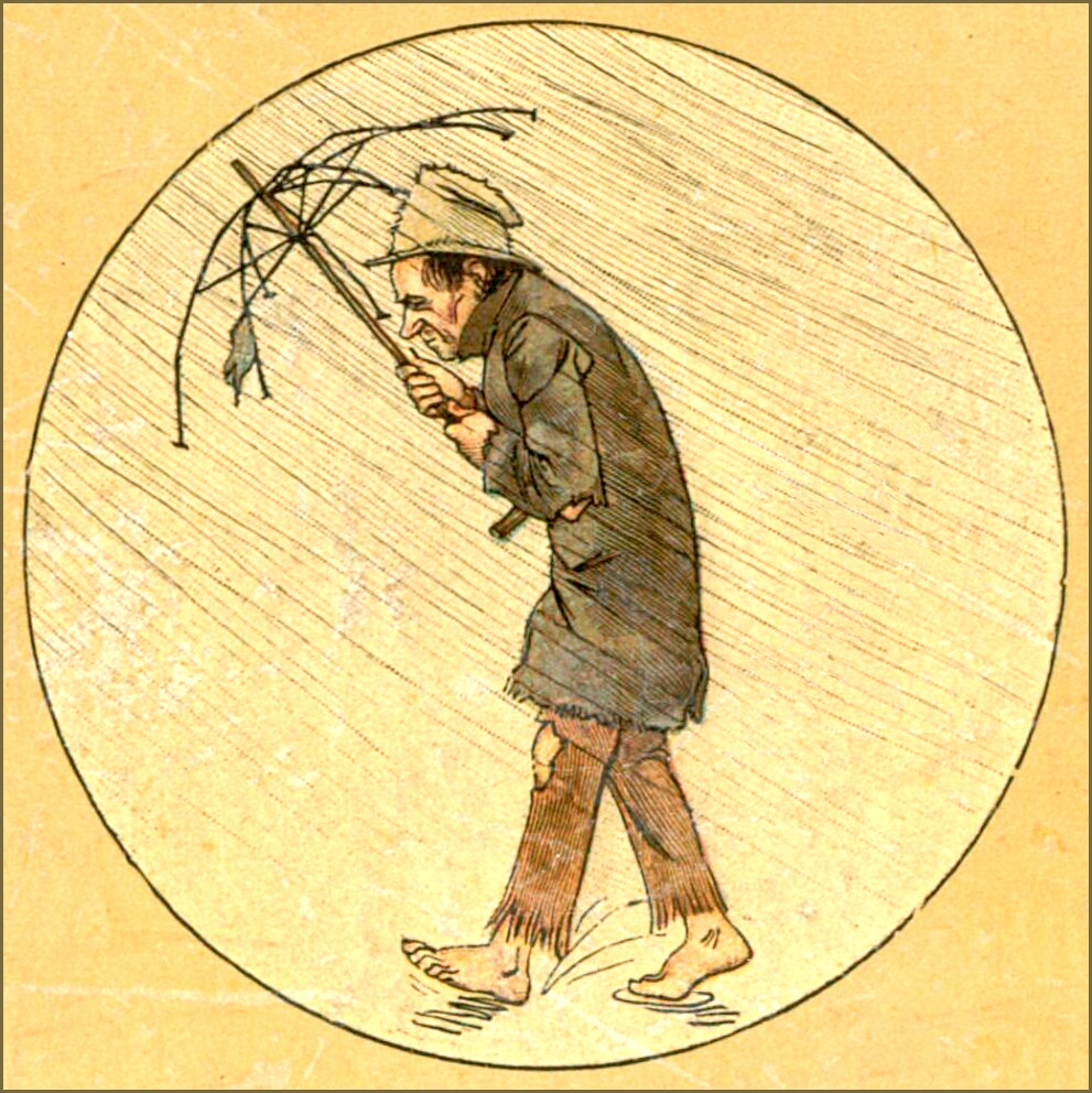 «Quelle distraction d’avoir oublié mon parapluie! Aussi ma femme aurait dû m’y faire penser; et justement j’ai mon pardessus neuf!»