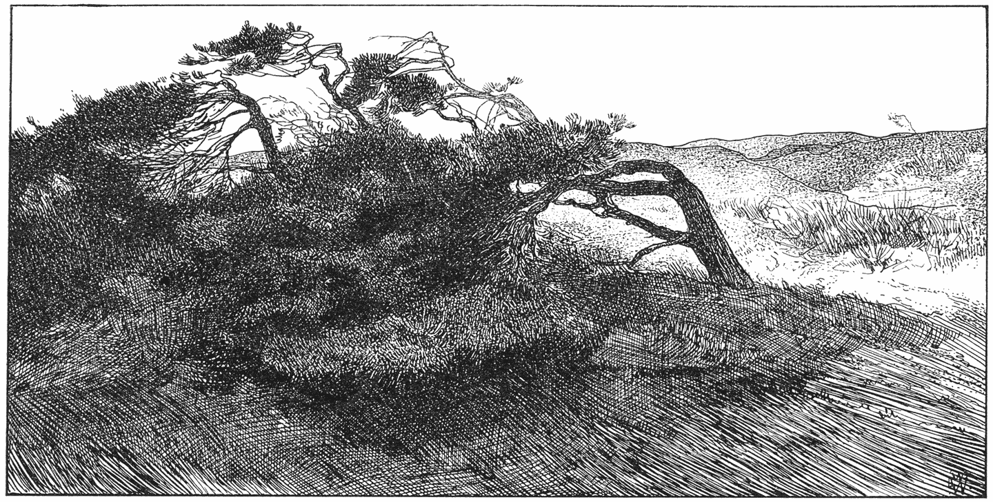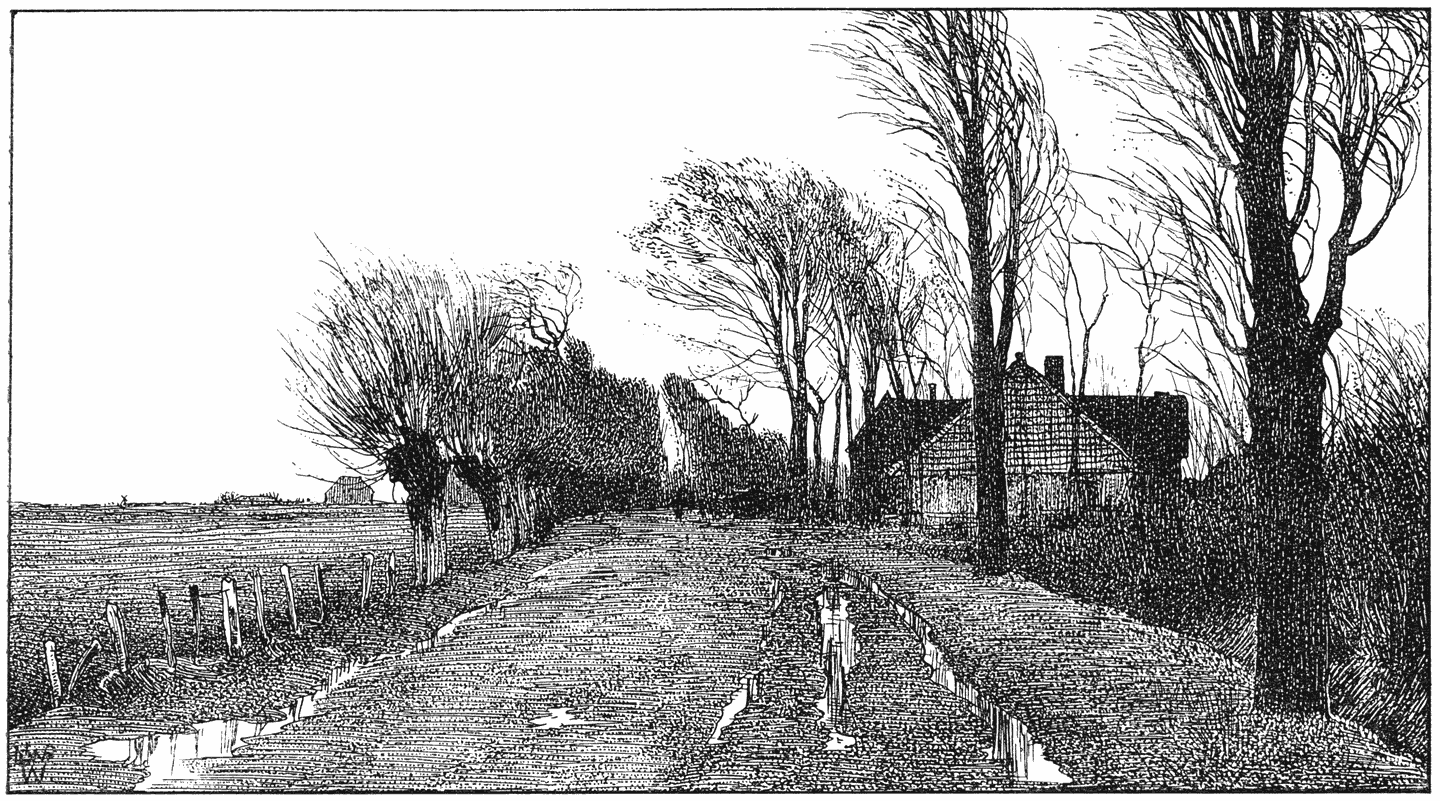 e winter begint, wanneer Manus het dak schoonveegt en dat is na den eersten Novemberstorm van beteekenis. Gedurende de heele Octobermaand zijn er ook wel bladeren van de boomen gevallen, doch niet zooveel opeens, dat de pannen vervuilden of de goten verstopt raakten. Nu echter komt alles tegelijk los. De boomen, die eerst nog, ondanks de geleden verliezen, goed in ’t blad zaten, staan daar nu opeens kaal en doorzichtig en weg en bosch ligt duimdiep onder de bonte afgevallen bladeren. Alleen het jonge eikenhakhout, dat op beschutte plaatsen groeit en de dikwerf gesnoeide beukenhagen (100) behouden het afgestorven blad, dat, bruin en droog, de heelen winter door, bij ieder windje kouwelijk ritselt.