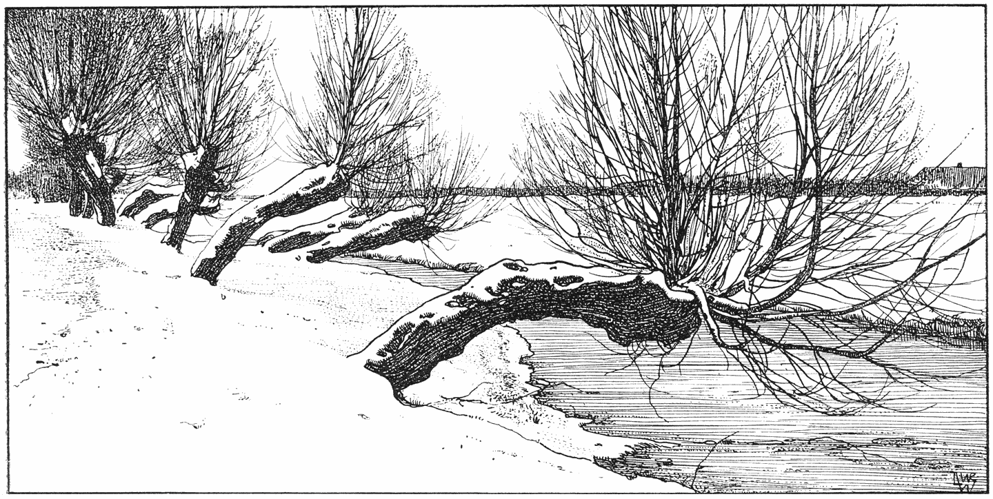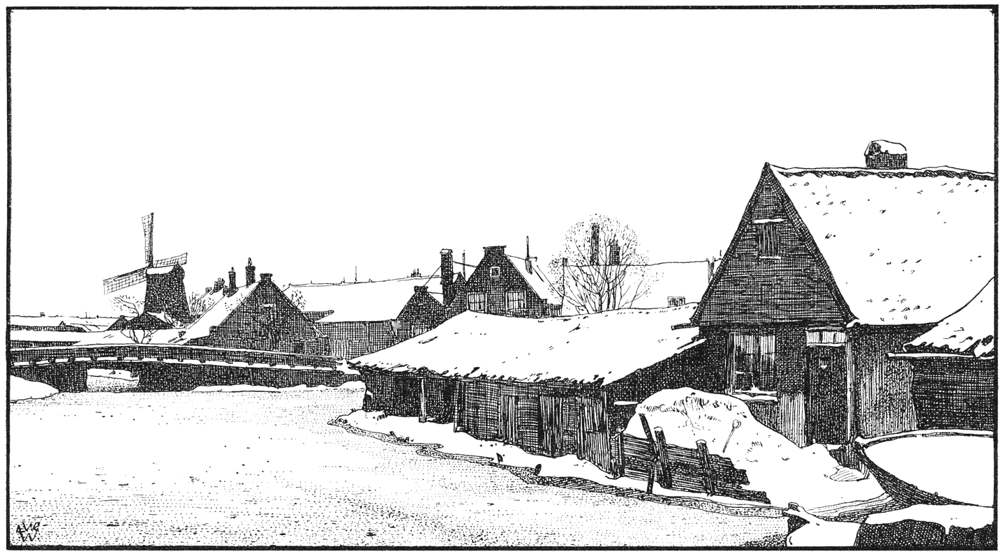 Het bladerlooze jaargetijde, de winter, is begonnen. De gevallen bladeren zijn als een voorbode van de sneeuwbuien, die nu gaan volgen. Wij kinderen dreven indertijd de gelijkenis wel zoover, dat we na zulke stormen in en met de afgevallen bladeren speelden als met sneeuw. Wij gooiden er mee, begroeven elkander erin en bovenal leek het een groot genot om een kwartier ver langs den straatweg te loopen, aldoor met de klompen, bij wijze van sneeuwploeg, schuivend in de dikke bladerenlaag. Van herfstweemoed en wintervrees hadden wij geen begrip. Alleen duurde het ons wat lang [6]eer de eigenlijke winter met sneeuw en ijs kwam. Je haalt dan in ’t begin van November, als voor ’t eerst de plassen op straat bevriezen, je schaatsen uit ’t vet, maar dan duurt het nog wel een week of acht, voordat er ernstig aan rijden gedacht kan worden.