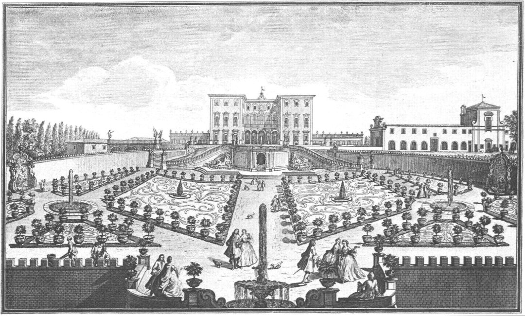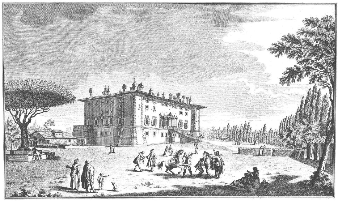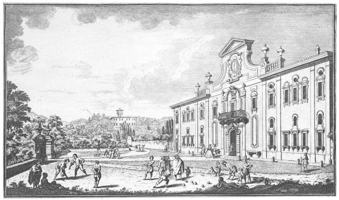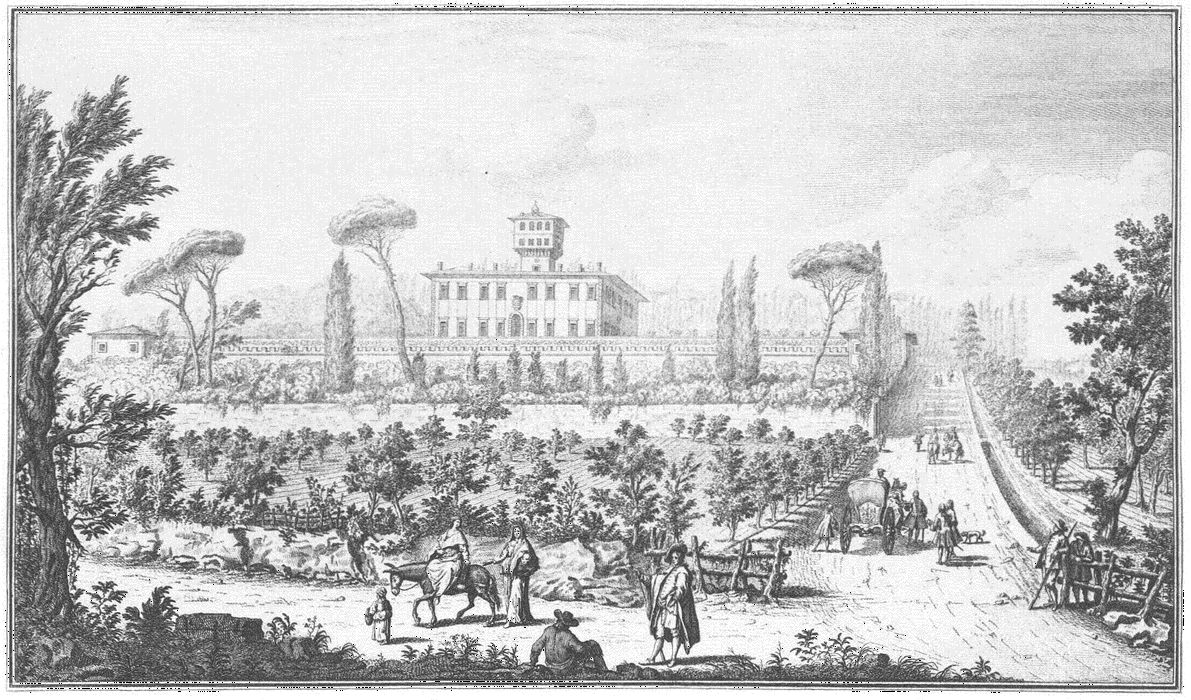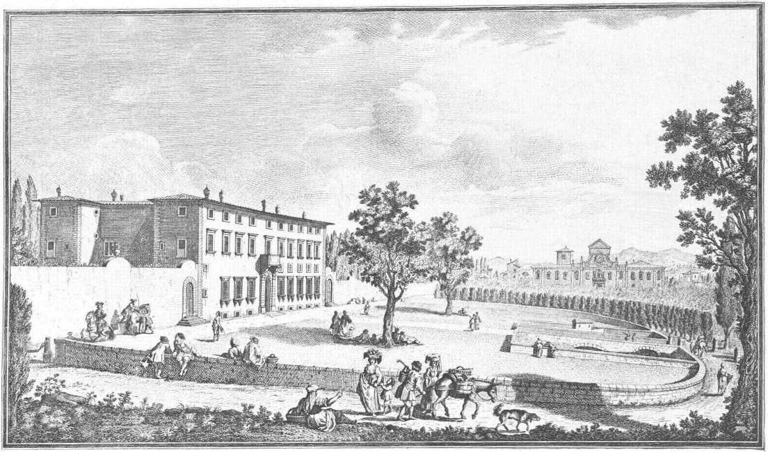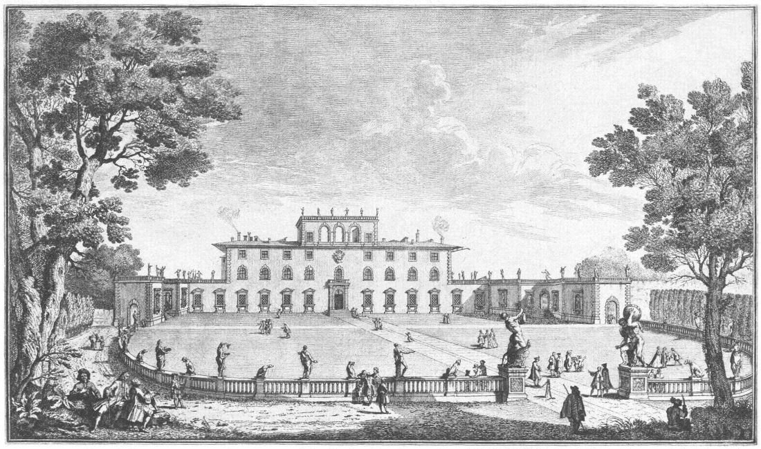 Visitors to Florence are more or less intimately acquainted with the history of her churches, galleries and palaces, but there are few books dealing with the villas which crown the hills surrounding the lovely city. For years friends have asked me to write some account of them and the first beginning was made in an article in the National Review (May 1894) called “A stroll in Boccaccio’s country,” dealing chiefly with the two villas described by him in the Decameron in language of matchless grace and charm. Becoming interested in the subject I collected what information I could about the Florentine Villas and the families to whom they had belonged, and coming across Guiseppe Zocchi’s rare work Vedute delle Ville e d’altri luoghi della Toscana published in 1744, it was thought that reproductions of his beautiful etchings would enhance the interest of my book. Zocchi, about whom but little is known, was born near Florence in 1711 and died in 1767. Frescoes were executed by him in the Serristori and Rinuccini palaces and he was commissioned by the people of Siena to decorate their city with painted tapestries and hangings for a visit of Leopoldo, Grand Duke of Tuscany. This he probably owed to his patron the Marquis Gerini to whom the volume of engravings of the Villas was dedicated.