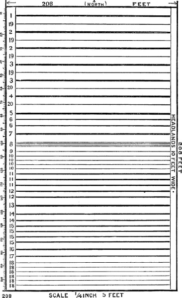 In plowing, a good, wide headland should be left at each end of the garden; it should be wide enough to allow the horse and cultivator to come clear out from between the rows and to turn into the next[13] row, without damaging the plants at the ends of the rows by trampling and dragging the cultivator over them.
