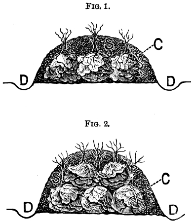 The term “hills,” as used here and elsewhere in this paper, does not imply heaped-up soil, but simply means that several seeds are to be planted together in one place, on a level with the rest of the ground. This I have found to be better than heaping up the[188] ground to form hills, which soon dry out and are difficult to water.[24]