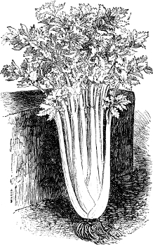 Sow Celery seed in a hotbed or cold frame. When a few inches high, plant five inches apart, in a bed, in[190] the open ground, which should be especially prepared for the purpose by extra heavy manuring. Let the plants remain in this bed, to grow strong and stocky. Never let the ground in this bed become dry; give thorough cultivation and cut off the tops of the plants once or twice, to make them grow stocky. When six or eight inches high, lift the plants carefully and set them six or eight inches apart, in trenches a foot wide and fourteen or more inches in depth. Several inches of rotted stable manure should be mixed with the soil at the bottom of the trench. When planting, firm the ground well around each plant. Supply enough water to keep the ground at the bottom of the trench very moist all the time. As the plants grow, press soil around the bottom of each plant and tie together at the top with string, to keep the stems straight and in an upright position. The blanching or earthing up is done by gradually filling up the trench with ground as the plants grow. Care should be taken not to get any ground into the hearts of the plants and never to earth up while they are wet. Sowing seed in the open ground and growing plants on the level surface may do for cool northern latitudes, but my experience is that it will not do here in southern Illinois. Boston Market and Crawford’s Half Dwarf are as good as any of the taller varieties, and are more easily blanched.[26]