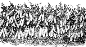 Pole Beans, as the name implies, require poles or some other support for the vines to twine upon. The poles must be set firmly, to prevent being blown over by the wind. Where poles are not procurable, the vines may be trained upon strings stretched up and down along two wires, which are stretched and firmly fastened to posts or stakes, one wire above and the other below. Pole Bean trellis, seven feet high, can be purchased, and will answer the purpose for which they are intended. The best pole bean of its kind is the Large White Lima. Being very tender, it should not be planted before the ground is warm. The beans will come up sooner if the eye in the seed is placed downward. The seed should be lightly covered with mellow soil, as this bean, considering its size, has less penetrating power in coming up than any other kind. In rainy seasons I have covered the seed with coffee grounds, which never became compact or hard[186] from the beating rains, and nearly every bean came up nicely, while those covered with earth were almost a total failure.[23] The Large White Lima is generally considered difficult to grow, but I cannot say so, as I have grown it without much difficulty, and had beans to perfection by the pailful throughout the summer. Mine were planted in very rich soil and the rows were about four feet apart, three plants to a hill, and the hills two feet apart. If supported by a trellis, beans should be placed one foot apart in the row. The above applies to all pole beans, whether Limas or string beans. Of the latter class of beans I have found White Creaseback a variety of great merit. Southern Prolific and Dutch Case Knife are also good. At the North, where the seasons are too short for the Large Lima, the Small Lima or Sieva, as it is also called, should be planted.