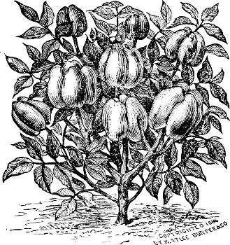 [10] A very distinct and novel variety has just been introduced from China, under the name of Celestial Pepper. The small, nearly heart-shaped fruits are produced in great abundance, growing upright, and are of a beautiful creamy yellow color until fully ripe, when they turn coral red: the plant is handsome enough for the flower garden. Among the largest of the sweet, mild red peppers are Spanish Monstrous and Procopp’s Giant, while among the hottest of all peppers is the Long Narrow Cayenne.—Ed.
