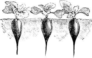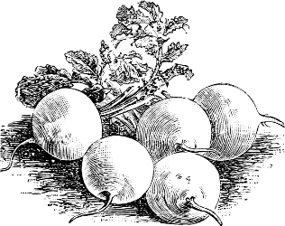 [13] For forcing, Wood’s Early Frame is preferred to the Long Scarlet; it is of same shape, but not so long, and has less foliage. Other good early radishes besides those named are Early Round Dark Red, Half Long Scarlet, Early Oval Dark Red, Early White Turnip, French Breakfast and the White Tipped Turnip Radishes. A variety of these handsome little radishes on the table is both attractive and appetizing.—Ed.
