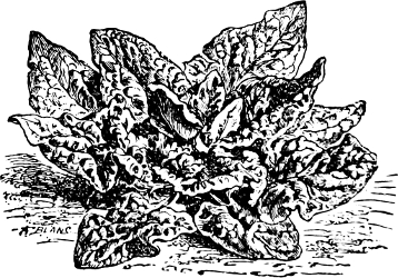 Seed of Endive should not be sown early, as this plant is grown chiefly for late summer and autumn salad. In this latitude we sow at intervals from the middle of June to the 1st of August. Seed may be sown either broadcast or in drills, but the plants should be thinned so as to stand from six to nine inches apart. It may also be sown in a seed bed and be transplanted to the proper distance apart. When the plants are full grown, tie all the outside leaves together over the heart, to blanch the inner leaves, which will take about a week. To keep up a constant supply, some should be tied up every few days. Never tie up when the leaves are wet or they will soon decay. Green Curled and Batavian are both very good.[27]