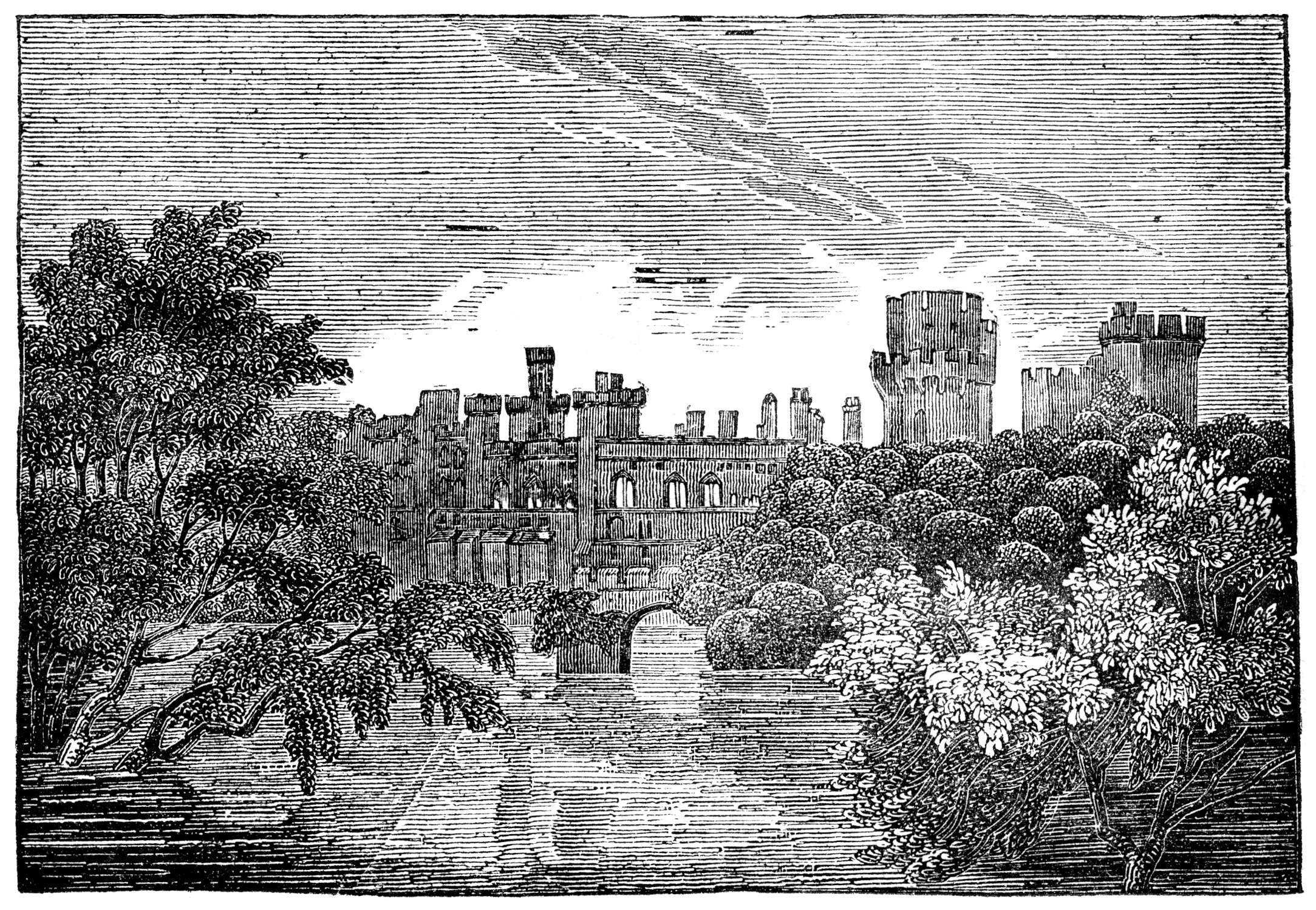 Warwick Castle is one of the most interesting monuments of feudal grandeur in the kingdom. The view which we have given above is from the River Avon, from whose banks the principal part of the edifice abruptly rises, being built upon the solid rock of freestone which bounds the river. Viewed by itself, this portion of the building is not the most picturesque. But taken in connection with the ancient towers of the castle, with the ecclesiastical edifices of Warwick Town in the back-ground, and with the Avon and its beautiful bridge in front, it would be difficult to find a scene more imposing,—certainly impossible to find one so rich in historical associations, which should be also so uninjured by time.