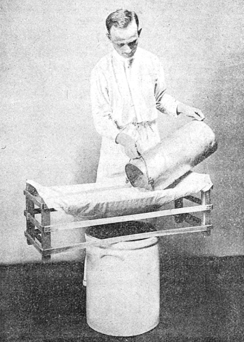Cooling the curd.—While the cooling of the curd is very desirable, it is not absolutely necessary. The object of cooling is to facilitate the more rapid expulsion of whey during pressing. Cooling also seems to harden the curd so that it does not pass so readily into the meshes of the drain cloth and thereby interfere with and retard the expulsion of the whey. The bags of curd are placed on ice, or cracked ice is placed about them and left for a few hours.