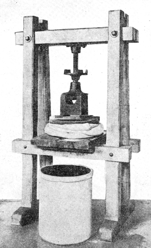 Pressing.—After cooling, several bags of the curd are piled together between two boards and a weight of 50 pounds placed on top. (See fig. 2.) Frequent rearrangement of the bags will hasten the process. After this weight has been left on the cheese overnight, the curd should be in flat cakes. For Neufchâtel it is preferable[Pg 9] to press the curd from 30 pounds of milk until the pressed curd weighs 4½ pounds, while for cream cheese it should weigh about 5½ pounds. Special care should be taken in determining the yield of cheese in order to obtain a uniform quality from day to day, which can be done by weighing the curd. The manner and length of time of pressing determines, in a large measure, the texture of the cheese. By using a screw press the curd may become too dry and gummy, but under ordinary conditions there is little danger if improvised equipment is used. (See fig. 3.)