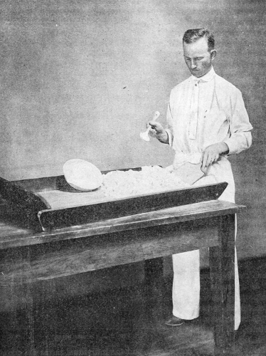 Fine, dry salt is sprinkled over the curd at the rate of about 2 or 2½ ounces to 10 pounds of curd, or about two level tablespoonfuls to the curd from 30 pounds of milk. (See fig. 4.) The quantity of salt may be varied to suit the individual taste; the quantities recommended, however, usually give the best satisfaction. If the curd is worked with a potato masher the addition of salt aids in obtaining the proper smoothness of the cheese.