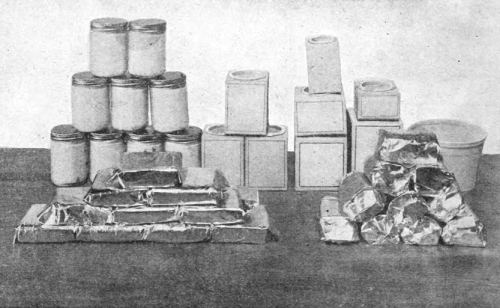 Packages.—Tin-foil or aluminum-foil wrapping paper which has a parchment paper inside is generally used in wrapping cream and Neufchâtel cheeses, since it gives each package a bright, uniform, and attractive appearance. (See fig. 7.) Great care should be taken to wrap each cake neatly and securely in order to exclude the air as much as possible. Any “frilling” or other irregularities may be corrected by drawing the foil tightly about the cheese. Careful and skillful wrapping tends to increase the length of time the cheese is salable. The yellow or amber-colored mold which often spreads over the cheese should be prevented as much as possible, not because it may render the food harmful or poisonous, but because it causes deterioration and renders the cheese less appetizing.