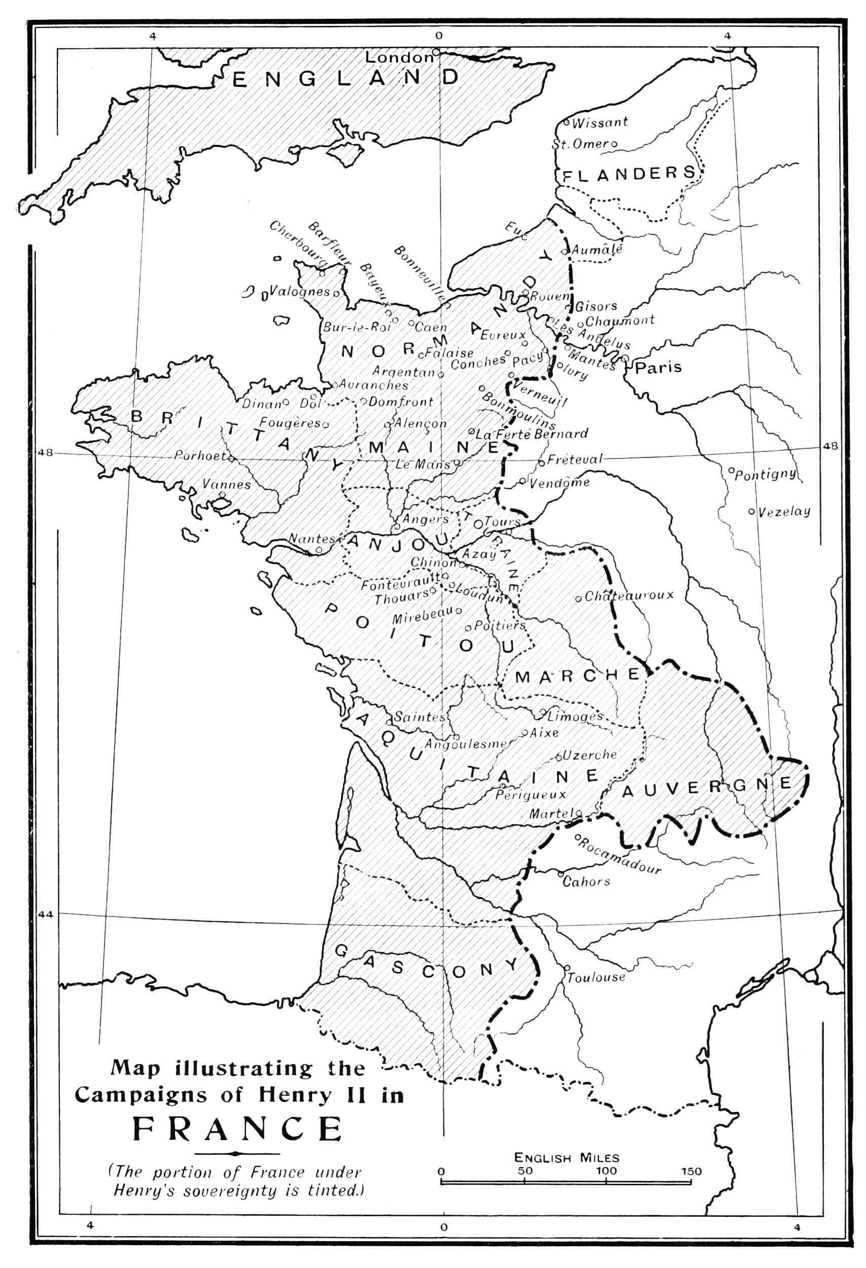 Henry had now established his claim to half of his grandfather’s dominions, and began to plan the recovery of the remainder by an invasion of England. His plans, however, were interfered with by the sudden death of his father on 7th September 1151. The recovery of England was postponed, but a great accession of territory was obtained by Henry in the following spring. Louis VII. had married Eleanor, the heiress of Aquitaine, in 1137, but relations between the able and energetic queen and her feeble husband had gradually become strained to breaking, and at last, early in 1152, they discovered{8} that they ought never to have married, being related to one another, distantly but within the degrees theoretically prohibited by the Church.[4] A divorce was granted on 18th March, and Eleanor, avoiding the too pressing attentions of Count Theobald of Blois and Geoffrey of Anjou, Henry’s younger brother, intimated her willingness to bestow her hand and great possessions upon the Duke of Normandy. Henry, now nineteen, but with a reputation that many an older man might have envied, hastened at once to meet Eleanor at Poitiers, and they were married in May. By this marriage Henry became master of Aquitaine and Poitou, in addition to Anjou, Maine, and Normandy, and his rule reached from the Channel to the Pyrenees.