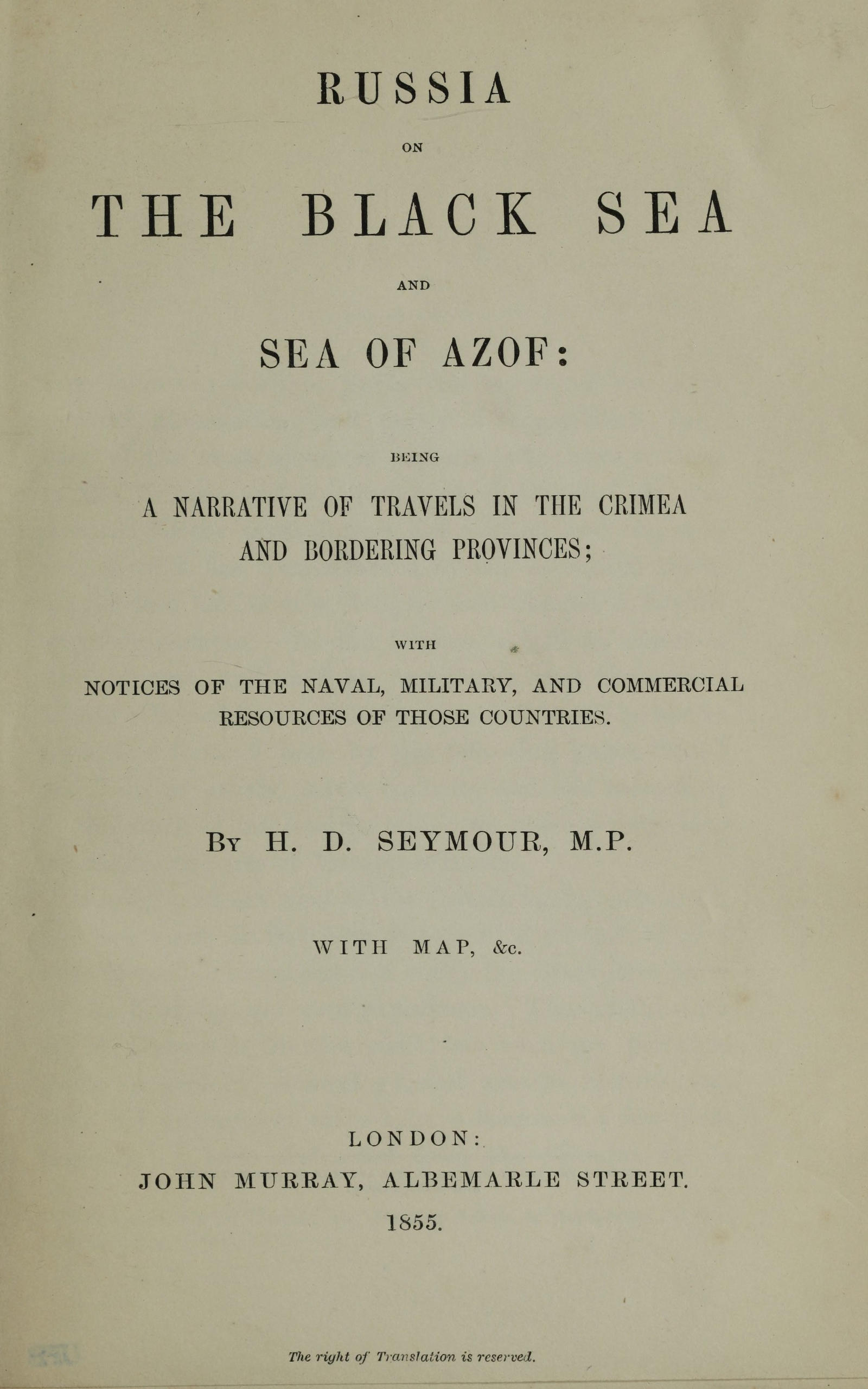 Having paid one visit to the Crimea in the year 1844, and two visits to Southern Russia in 1844 and 1846, I have been able to correct and verify the descriptive parts of the book by my own experience. The careful work of M. Dubois de Montpereux[1] has been my principal guide on geology, archæology, and ancient history, and from his magnificent atlas I have borrowed a few illustrations. I have abstracted from the ‘Études sur la [iv]Russie’ of M. Haxthausen an account of the Russian navy and army, adding matter acquired from other trustworthy sources. To the above-named book and that by M. Tegoborski,[2] both standard works on the internal economy of the Russian empire, I am much indebted; and although I think their accomplished authors write under a strong bias, yet their works are indispensable to those foreigners who wish to study the resources and organization of the Russian empire. M. Tegoborski has not been allowed to state his whole opinions upon some subjects, and the Censor has obliged him to make material alterations, particularly where he speaks of the condition of the peasantry. I have likewise alluded to a discussion which took place last year in the ‘Revue des Deux Mondes,’ in which this gentleman took a part. In the course of last summer a very able article appeared in the French ‘Moniteur,’ on the subject of Russian Finance, in which it was attempted to be proved that Russia was very weak on this point, and could not hold out for any lengthened period against the Western Powers. The subject was followed up by M. Léon Faucher in the ‘Revue des Deux Mondes,’ in a damaging article on Russian resources and finance. Soon afterwards an answer to this was sent from Petersburg, written by M. Tegoborski, who is an employé in the Bureau des Finances, and it appeared in the November number of the Revue, with a rejoinder by M. Léon Faucher, written just before his lamented decease. Notwithstanding [v]the truth of M. Tegoborski’s observation, that Russia cannot be judged by the same rules as other European nations in matters of finance, owing to her totally different state of civilization, I think he fails to prove the main object of his article, that Russia can stand many more such campaigns as that of 1854. Russia must have little hope of persuading us of her power by other means, when she is obliged to have recourse to an article in a foreign periodical in the midst of a deadly struggle.