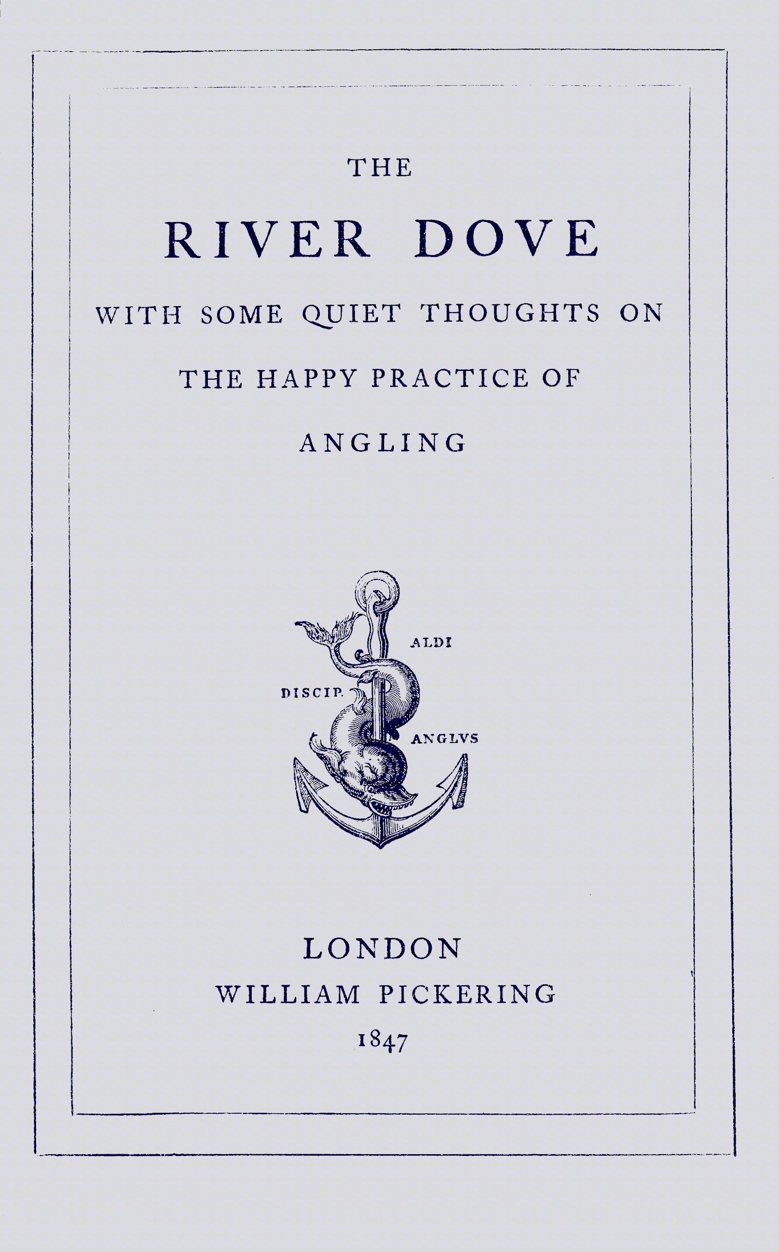 But I beseech you to be civil, and moderate in your censures; for I undertook those pleasant walks, to which I here invite you, by the banks of the Dove (now ten years are past) to unbend my mind from some serious cares. And that I may not detain you from the perusal, I have only this ivfurther to desire,—that we may all have a south wind when we go a-fishing,—and be blest with a virtuous cheerful spirit, a peaceful conscience, and at last eternal rejoicings in the kingdom of angels.