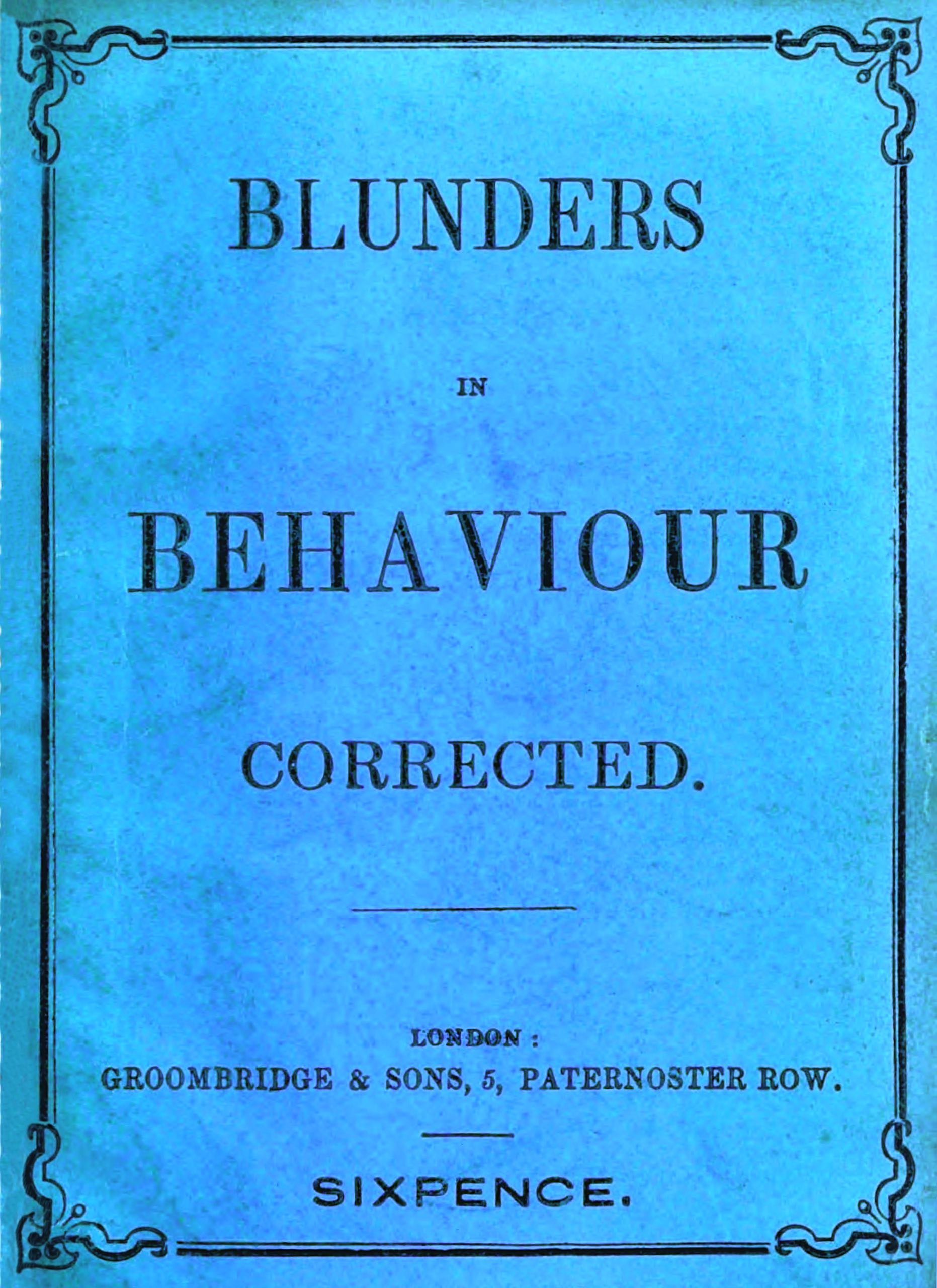 The affectation of wisdom is a very common vice amongst [Pg 15]pseudo-students. For instance, Mr. Smallweed, who is really a well-informed man, is so conceited in this respect that he cannot, when the subject of the conversation affords him opportunity, avoid interlarding his remarks with technicalities and remote allusions. He would not speak of finches or whales but under the Cuvierian terms of Fringillidæ or Cetacæ, or refer to the Canadian columbine, or the field pimpernel, but under their botanical names of Aquilegia Canadensis or Anagallis arvensis. Such terms are neither elegant nor appropriate in mixed society; and so far from causing the ladies to look up in astonishment at the profound learning of the speaker—an effect usually intended and wished for—they are more likely to indulge in a sly titter, and vote his hard words a bother. This is the “little learning” which Bacon terms “a dangerous thing” and must be avoided by those who would cultivate good-breeding, which is always more allied to simplicity of expression, and transparency of conduct, than to complicated technicalities, or dark mysterious doings. Another fault of Mr. Smallweed is, that he never pays proper attention to another speaker; the music of his own voice is too great a charm for him, and he thinks it must have a very siren-like tone to others; so he rambles on till some wag asks him if he has a dictionary with him, when he drops into sulkiness, looks black, and is quieted for a time. While upon Mr. Smallweed’s failings, let me refer to his habitual mode of referring to other persons, for this fault of his is very common to the civilized specimen of (to use his phrase) the anthropological animal. For instance, instead of saying, “My friend, Mr. Simpson, told me so-and-so,” he invariably says, “Simpson told me so-and-so,” or, “Longman’s are the publishers of So-and-so’s book.” A gentleman never drops the “Mr.,” or the “Messieurs,” the “Dr.,” the “Professor,” or any other title or mode of address to which persons are entitled. It is ungentlemanly to speak of “Bulwer’s last novel,” or “the new edition of Gill’s Commentary.” We should say, “Sir Edward Lytton Bulwer,” and “Dr. Gill,” and not abbreviate, as if a respectful mention of a person cost us more breath than he is worth.
