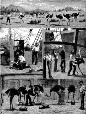 After being taken out of their boxes the birds are allowed to take a little exercise just to make themselves at home, and are then arranged in wooden kraals, of which there are two hundred on board the vessel. The ostriches are induced to move from one place to another by catching hold of their bodies, and using a little gentle force.