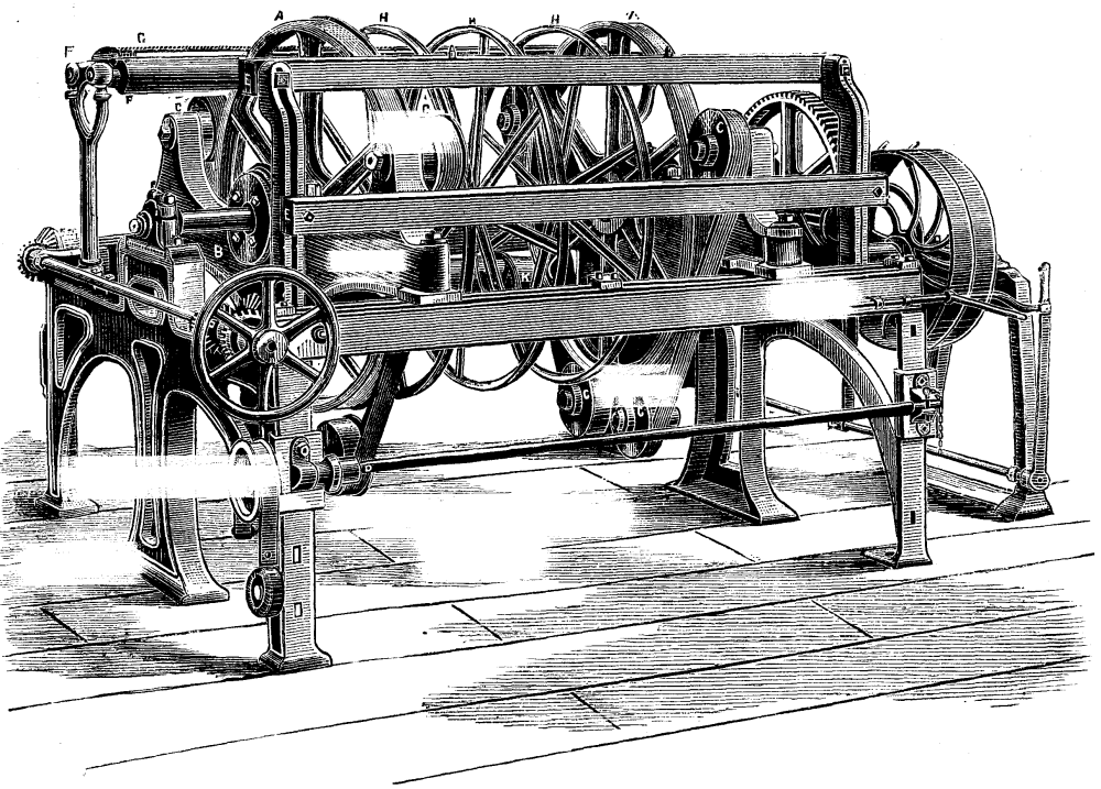 The machine now illustrated is one we have recently seen in operation in a Salford finishing works. It is an improved form of another stretching machine which had been turned out in considerable numbers by Mr. Archibald Edmeston, engineer, of Salford, who makes a specialty of calico printers' and finishers' machinery. The improvements consist mainly of a simplification of the working parts and thoroughly substantial construction of the machine. The principle adopted is a well-known one. The selvages of the cloth, or more strictly the two edges of the cloth, of a width of about two inches, are caused to pass over and at the same time are held by the rims of two diverging pulleys. The rims are further apart where the cloth leaves them than where they seize it, hence the stretching is gradually, certainly, and uniformly performed. The cloth is gripped by the pressure of an endless belt acting against the lower half of each pulley, the edges being held between them. In the engraving these stretching pulleys are indicated by the letters AA; the endless leather band passes over the pulleys, CC, of which there are a set of four provided for each stretching pulley. The lower pair of pulleys in each case may be tightened up by a screw for the purpose of imparting the requisite tension to the bands. The stretching pulleys are mounted upon and driven by the same shaft, an ingenious but simple swiveling joint in their bosses enabling them to be set at any angle to the shaft and yet to revolve and be driven by it without throwing any undue strain upon the working parts. The piece, wound upon the ordinary batch shell, is placed upon the running-off center, D; it is led off over the rails, EE, and then downward to the nip of the bands and pulleys, AA. As explained, the selvages are here gripped between the bands and stretching pulleys, the rims of which are wider apart at the back than the front, and thus, in being conveyed underneath, the piece is suitably stretched. Leaving the grip at the back it passes over leading-off rollers, FF, and the scrimp or opening rail, G, and thence downward to the winding-on center, which cannot be seen. The winding-on center is driven by friction. As the batch fills it and tends to wind faster than the machine delivers the cloth, the driving slips. In addition to a capability of being set at an angle to the shaft, the stretching pulleys, AA, may be slided upon, so as to separate or bring them closer together, to allow for the treatment of different widths of cloths. This adjustment is provided for by mounting the stretching pulleys, AA, and the band pulleys, CC, etc., on frames, BB, the ends of which rest, as shown, upon rails, at the back and front of the machine. The adjustment either for width of piece or for the angularity (extent of stretching) is easily made by the hand-wheel, L. By the bevel wheels shown, two cross screws having nuts connected to the ends of frames, BB, are actuated in such a way that as desired the space between the back and front of the pulleys may be closed in or opened out, or the two wheels, maintaining the same angularity, may be separated or closed in, either adjustment being expeditiously made. The wheels, HHH, are called center stretching wheels, the use of which is sometimes advantageous. They act in conjunction with a set of stretching pulleys, of which one, K, may be seen in illustration. By a proper adjustment at the latter the piece is bent into a wavy form, where it passes between the whole of them, the effect of the corrugation being to loosen the center threads and to allow the piece to be more equally stretched with those near the selvages and more easily. This part of the machine may be used or not as required. The production, we observe, was about 120 yards per minute. The machine is solidly built and well fitted together, as was obvious to us from an inspection of some in course of construction at the maker's works. It is also claimed to be of considerable advantage to bleachers and finishers of white goods, on account of the uniformity of the stretching causing but small disturbance to the stiffening.--Textile Manufacturer.