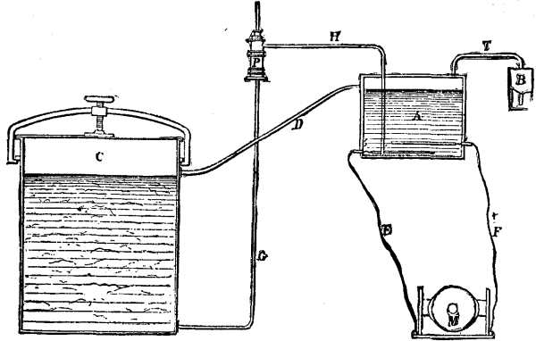 The apparatus consists of a hermetically closed electrolyzer, A, into the lower part of which enters the electrodes, E and F, of any electrical machine whatever. The receptacle, A, is provided with a safety-tube, T, that issues from its upper part and communicates with a reservoir, B. A second tube, D, forms a communication between the electrolyzer and the vessel, C. The liquid contained in this latter is sucked up by a pump, P, and forced to the lower part of the vessel, A, by means of the tubes, G and H.