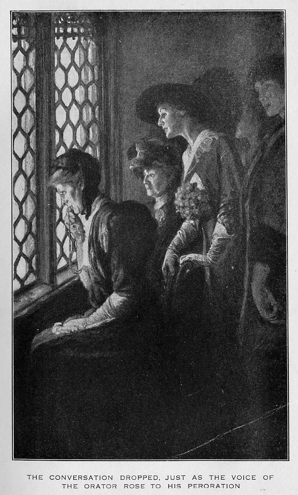 Within that privileged section of the Ladies' Gallery to which only the Speaker's order admits, there was no less agitation than on the floor below, though the signs of it were less evident. Some half a dozen chairs placed close against the grille were filled by dusky forms invisible, save as a dim patchwork, to the House beneath them—women with their faces pressed against the lattice-work which divided them from the Chamber, endeavoring to hear and see, in spite of all the difficulties placed in their way by a graceless Commons. Behind them stood other women, bending forward sometimes over the heads of those in front, in the feverish effort to catch the words of the speech. It was so dark in the little room that no inmate of it could be sure of the identity of any other unless she was close beside her; and it was pervaded by a constant soft frou-frou of silk and satin, as persons from an inner room moved in and out, or some lady silently gave up her seat to a new-comer, or one of those in front bent over to whisper to a friend behind. The background of all seemed filled with a shadowy medley of plumed hats, from which sometimes a face emerged as a shaft of faint light from the illumined ceiling of the House struck upon it.