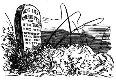 kicking at the place where they're joined, would permit, And wandered off, just about as far As I conveniently could, and then I sat down on a milestone and raised my voice to Heaven, and cried aloud, that, weather permitting, General GRANT should never, never, NEVER, go back to the White House, not if I could help it, To puff on his cigar, Said ICHABOD BOGGS, said I. [4] We hope none of our readers will labor under the impression that we look upon the above effusion as a poetical one, but, in this day of many isms, it may happen that the above style may become prevalent, and we think it our duty to present everything that is new. EDS. 2.02 TO HARNESS. Mr. Punchinello on the Turf. History relates that the era of Horse-racing commenced about the year 680 B. C., but it was some time after that when Mr. PUNCHINELLO made his debut as a candidate for the honors of the turf. To put the matter more concisely, it is just six days since he drove his horse "Creeping Peter" on the track at Monmouth Park, Long Branch. The only object which Mr. P. had in view, when he purchased his celebrated trotter and put him into training, was the improvement of the breed of American horses. While our BONNERS, VANDERBILTS and GRANTS are devoting all their surplus time and means to this great end, Mr. P., in placing the name of his yellow horse in the hands of the poolseller, would scorn to have a less noble aim. But this great object need not interfere with others of less importance, and therefore Mr. P. will not deny that, after having exhibited to his friends and the sporting fraternity in general, his little investment in fancy horseflesh, he made up a very satisfactory betting-book. Now Mr. P. believed,—and events proved him to be correct,—that when his friends and the sporting fraternity saw his horse, they would bet heavily against him. Mr. P., however, in all the pride of amateur ownership, bet quite as heavily upon his noble steed. His friends and the above-mentioned fraternity chuckled and winked behind his back, but although Mr. P. heard them chuckle and knew that they were winking, his belief in his final success never wavered. Any ordinary observer might be expected to remark that Creeping Peter was not entirely without blemish. Besides being spavined and having three of his hoofs injured by sand-crack, he had poll-evil, fistulas, malanders, ring-bone, capped hock, curb, splint, and several other maladies which made him a very suitable horse for the general public to bet against. But Mr. P.'s courage never quailed! When he made his appearance on the track (for he drove his horse himself) he was the object of general attention. The following view (from a photograph by ROCKWOOD) gives an excellent idea of the horse and driver. Nearly everybody on the ground advised Mr. P. to leave his cloth in the stable, for it would certainly interfere with the speed of his horse and probably get wrapped up in the wheels and cause an accident. But Mr. P. would listen to nothing of the sort. He told everybody that he wasn't going to catch cold in his knees, even if he lost the race, and that he was perfectly willing to run the risk of accidents. For the benefit of his readers, however, Mr. P. will lift up this heavily shotted lap-cloth and show what was under it. Here is arranged a steam-engine, which drives the wheels of the vehicle, and which will of course propel the whole turnout, horse and all, at a great rate of speed. It will now be easily perceived why Mr. P. persisted in keeping his lap-cloth over his knees. The entries were as follows:
