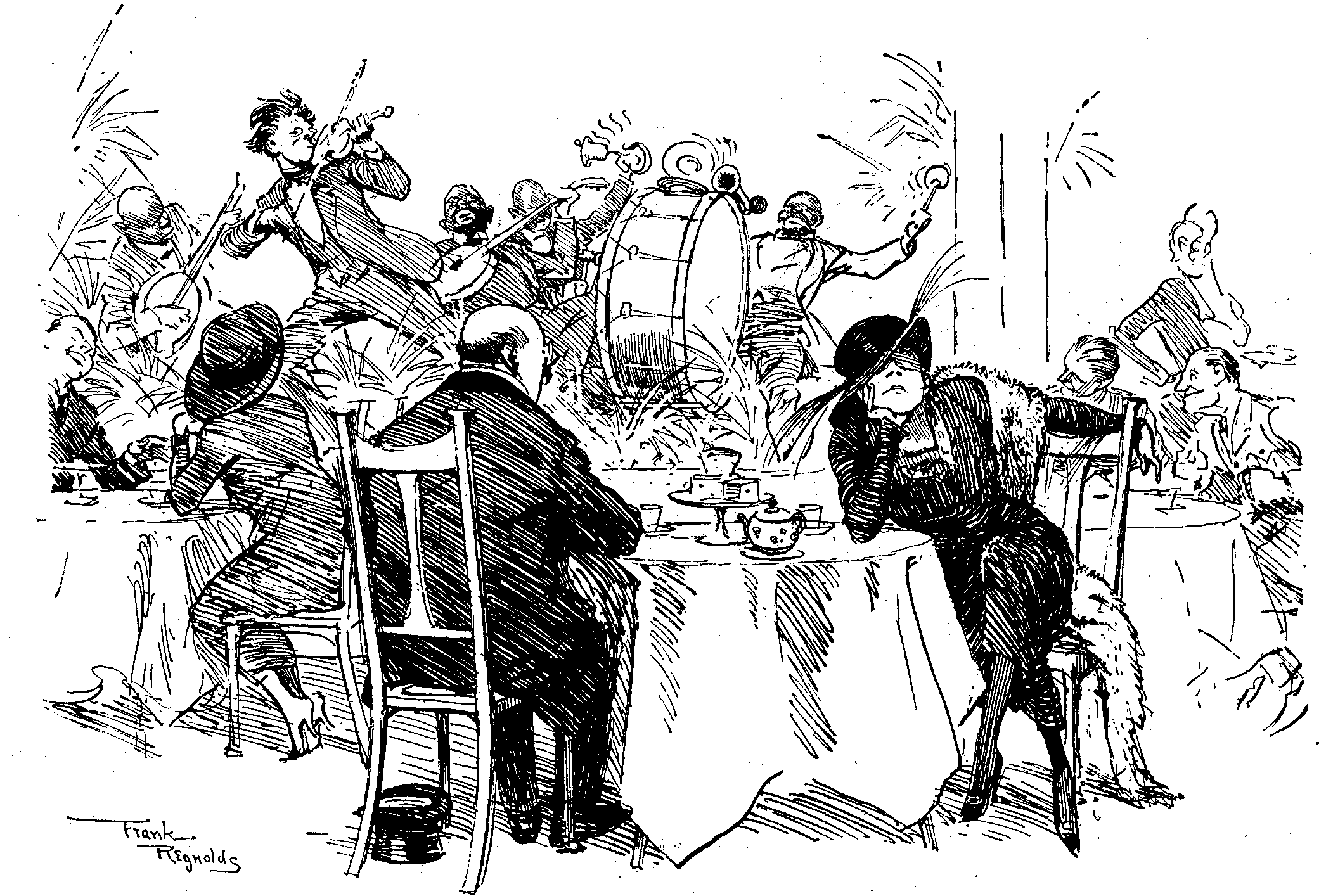Philistine (who has been dragged by wife to Jazz tea-shop). "WHAT IS IT THEY'BE TRYING TO PLAY, DEAR?"