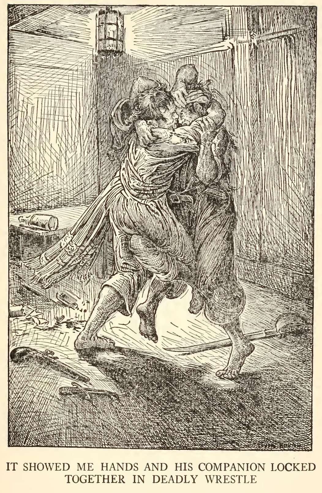“Mates,” says he, “there’s two of them alone there; one’s the old cripple that brought us all here and blundered us down to this; the other’s that cub that I mean to have the heart of. Now, mates—”