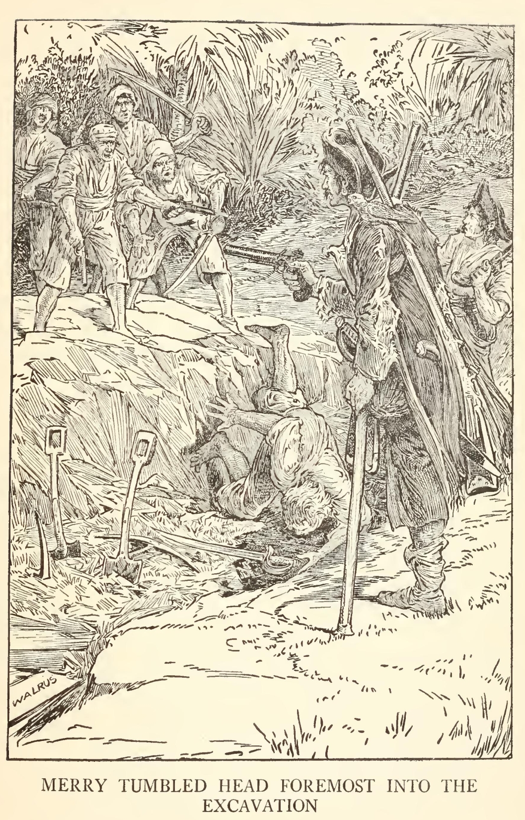 Before us was a great excavation, not very recent, for the sides had fallen in and grass had sprouted on the bottom. In this were the shaft of a pick broken in two and the boards of several packing-cases strewn around. On one of these boards I saw, branded with a hot iron, the name Walrus—the name of Flint’s ship.