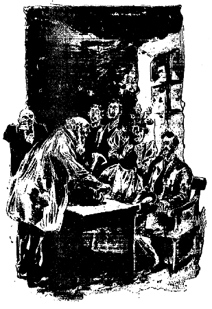 Mais Peter Peterson n'avait pas de ces délicatesses latines. Après s'être assuré que son phonographe fonctionnait comme il convient, il convoqua et réunit dans la pièce voisine de son cabinet, laquelle lui servait de salon—oh! combien indigemment meublé!—le ménage Humphry, le ménage Ouweston, le célibataire Krokwess, plus le solicitor Harris et un greffier, porteur de scellés. Après quoi, il leur tint ce langage, que je traduis fidèlement de l'anglais dont je ne sais pas un mot: «Estimés parents, gracieux solicitor, et vous, ineffable greffier, je sens que mon compte de jours mortels va être liquidé d'ici peu, et je me décide à mettre mes livres en règle avant de quitter ce comptoir de larmes, en exprimant, d'une façon indestructible, mes dernières volontés. Ce n'est à aucun de vous, malgré le grand cas que je fais de votre honnêteté, que j'entends les confier. Vous allez demeurer ici, sans vous dire, autant que possible, des choses désagréables, et sans vous disputer, par avance, mon bien, pendant que, dans mon cabinet à côté, je vais épancher ces confidences suprêmes dans oreille de cuivre d'un phonographe que j'ai acheté à cette intention, et qui les inscrira rigoureusement sous ma dictée, vous réservant le plaisir, mais un an seulement, entendez-vous, après mon trépas définitif, d'entendre ces doux aveux, de ma propre voix, ce qui vous donnera l'exquise illusion que je vis encore: c'est une attention gentille, n'est-ce pas?»