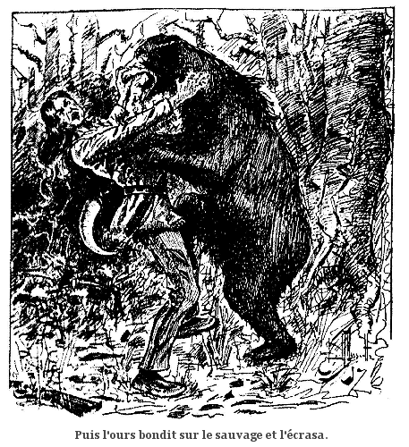 D'un coup de patte, l'ours fit voler le fusil au loin; puis bondissant sur le sauvage abasourdi, il l'écrasa sous sa masse pesante, lui labourant en même temps la poitrine, de ses longues griffes.