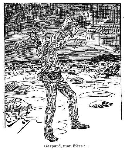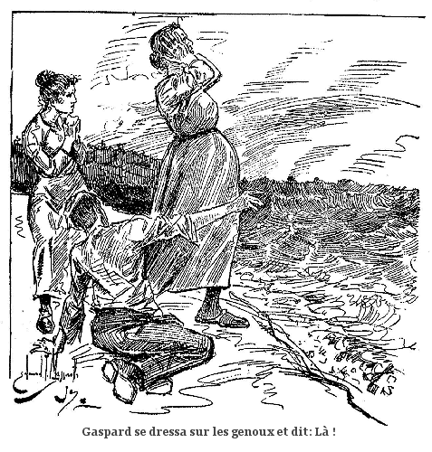 Gaspard Labarou, debout près de la lisse de l'arrière, tendant son poing fermé vers le fond de îa baie, disait:
