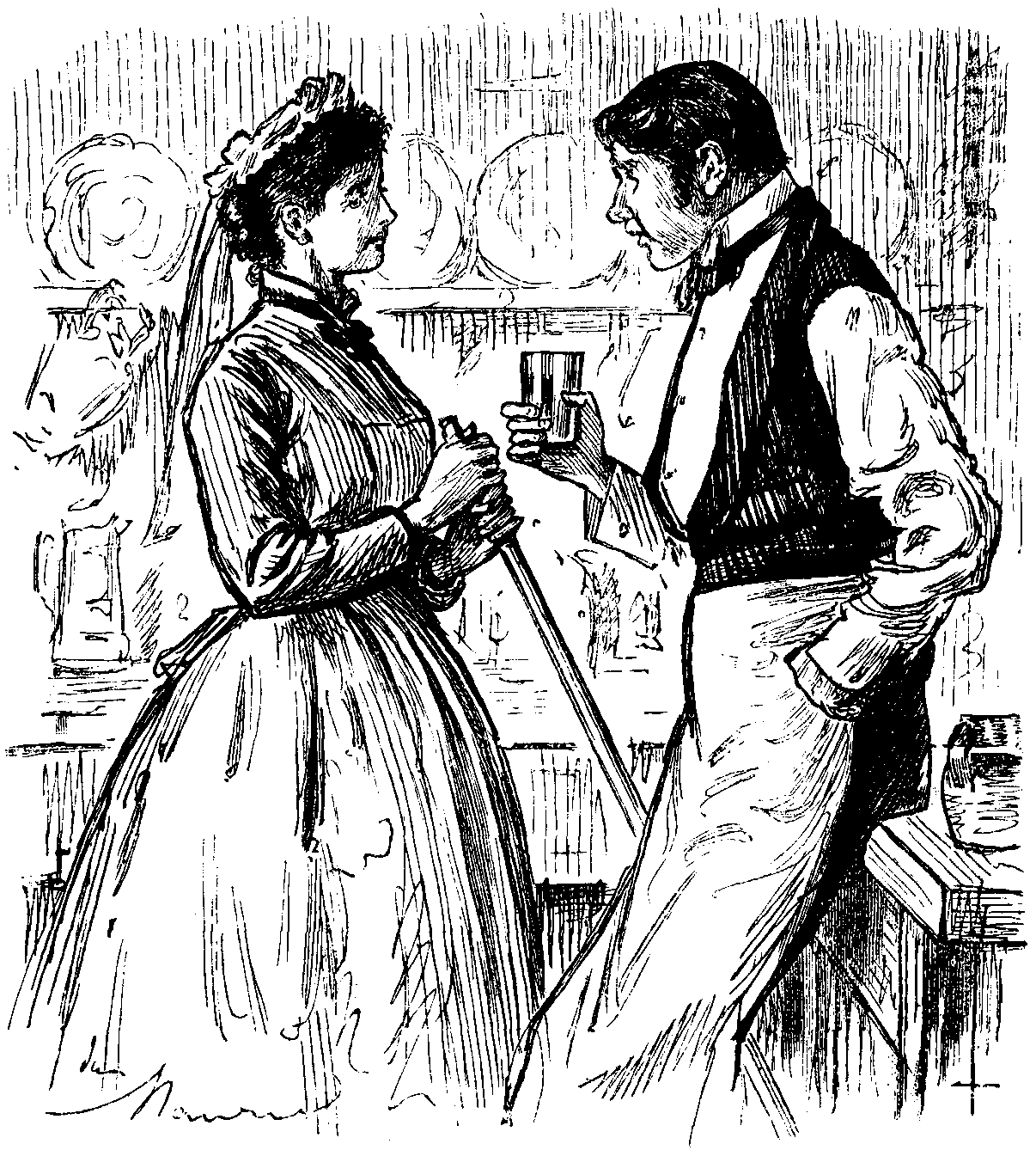 Fifth S.C. (a fat, fair man, with an impudent frog-face, who is trying desperately hard to take in a sceptical crowd with the too familiar purse-trick). Now look 'ere, I don't mind tellin' yer all, fair an' frank, I'm 'ere to get a bit, if I can; but, if you kin ketch me on my merits, why, I shan't grumble—I'll promise yer that much! Well, now—(to a stolid and respectable young Clerk)—jest to show you don't know me, and I don't know you—(he throws three half-crowns into the purse). There, 'old that for me. Shut it. (The Clerk does so, grinning.) Thank you—you're a gentleman, though you mayn't look like it—but perhaps you're one in disguise. Now gimme 'arf a crown for it. Yer won't? Any one gimme arf a crown for it? Why—(unprintable language)—if ever I see sech a blanky lot o' mugs in my life! 'Ere, I'll try yer once more! (He does.) Now oo'll gimme arf a crown for it? (To a Genteel Onlooker, with an eyeglass, who has made an audible comment) "See 'ow it's done!" So yer orter, with a glazier's shop where yer eye orter be! Well, if anyone had 'a told me I should stand 'ere, on Boat-Race Day too, orferin' six bob for arf a crown, and no one with the ordinary pluck an' straightforwardness to take me at my word, I'd have suspected that man of tellin' me a untruth! (To a simple-looking spectator.) Will you 'old this purse for me? Yer will? Well. I like the manly way yer speak up! (Here the Gent. Onl., observing a seedy man slinking about outside, warns the company to "mind their pockets"—which excites the Purse-seller's just indignation.) "Ere!—(to the G.O.) you take your 'ook! I've 'ad enough o' you. I 'ave. You're a bloomin' sight too officious, you are! Not much in your pockets to mind—'cept the key o' the street, and a ticket o' leave, I'll lay! If you carn't beyave as a Gentleman among Gentlemen, go 'ome to where you 'ad your 'air cut last—to Pentonville! (The G.O. retires.) There, we shall get along better without 'im. 'Ow long are you goin' to keep me 'ere? Upon my word an' honour, it's enough to sicken a man to see what the world's come to! Where's yer courage? Where's yer own common sense? Where's your faith in 'umin nature? What do yer expect? (Scathingly.) Want me to wrop it up in a porcel, and send it 'ome for yer? Is that what yer waitin' for! Dammy, if this goes on, I shall git wild, and take and give the bloomin' purse a bath! (The Simple Spectator feels in his pockets—evidently for a half-crown.) 'Ere, you look more intelligent than the rest—I'll try yer jest this once. Jest to show yer don't know me, and—(Shouts of "They're off! They're coming!" from the bank; the Purse-seller's audience suddenly melts away, leaving him alone with the Seedy Slinker.) 'Ere, JIM, we may as well turn it up. 'Ere come them blanky boats!