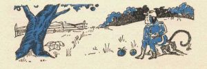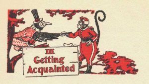 While he was wondering whether he had better fly away, or stay and quarrel with the rude person who had pelted him, the boorish stranger leaped from the tall tree into the smaller one where Mr. Crow was sitting. Then, dropping nimbly from limb to limb, with the help of his hands and his feet and his tail, he stopped at last when he had reached Mr. Crow's level.[Pg 9]