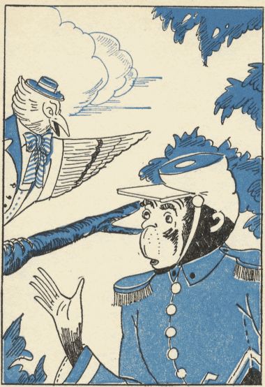 Old Mr. Crow couldn't help admiring the newcomer's clothes. He wore a red coat trimmed with gold braid, and bright blue trousers.[Pg 10]