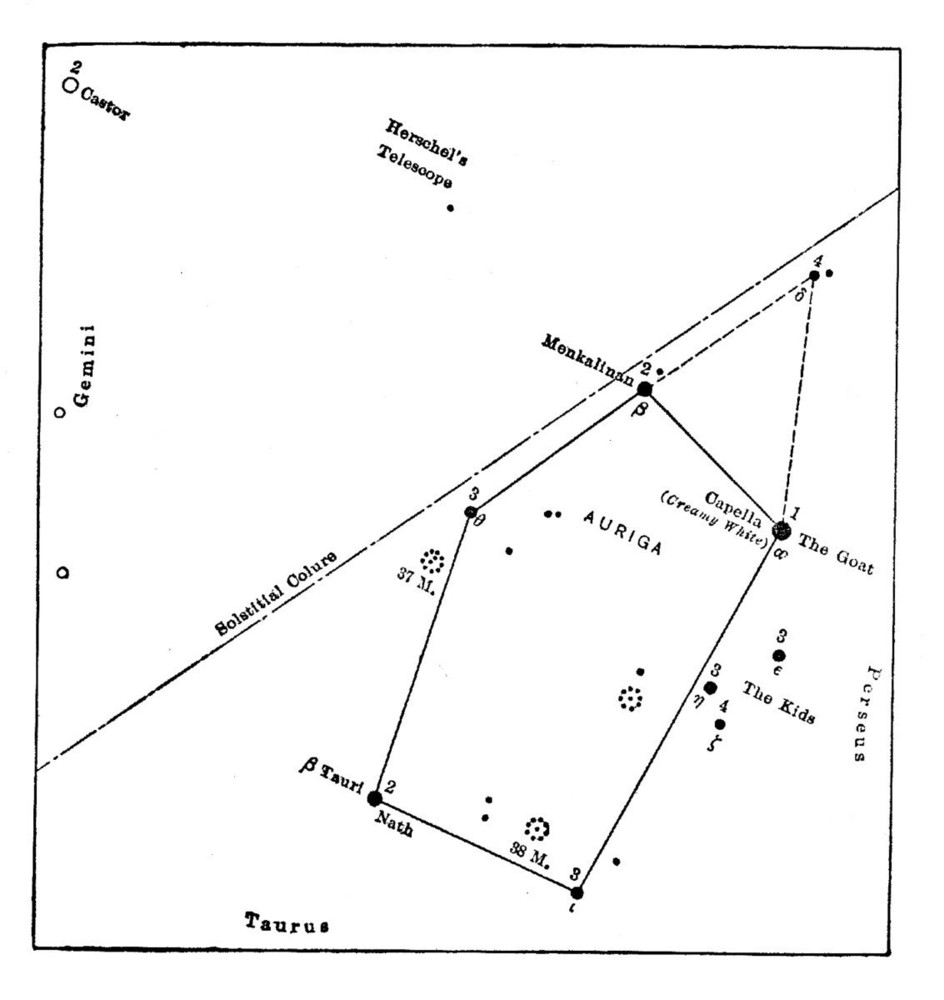 | Located by a line drawn from Auriga to Gemini and prolonged. | ||