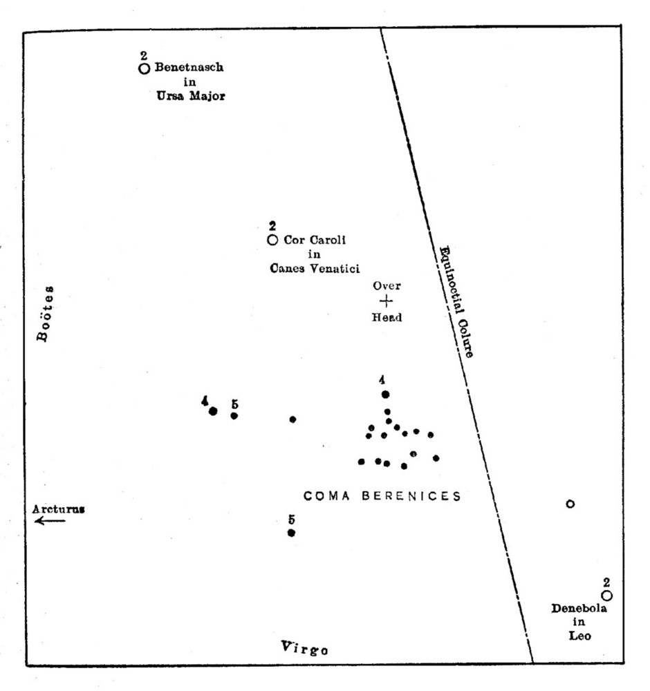 | Cor Caroli, its brightest star, is about 17° south of Alioth in Ursa Major. | ||