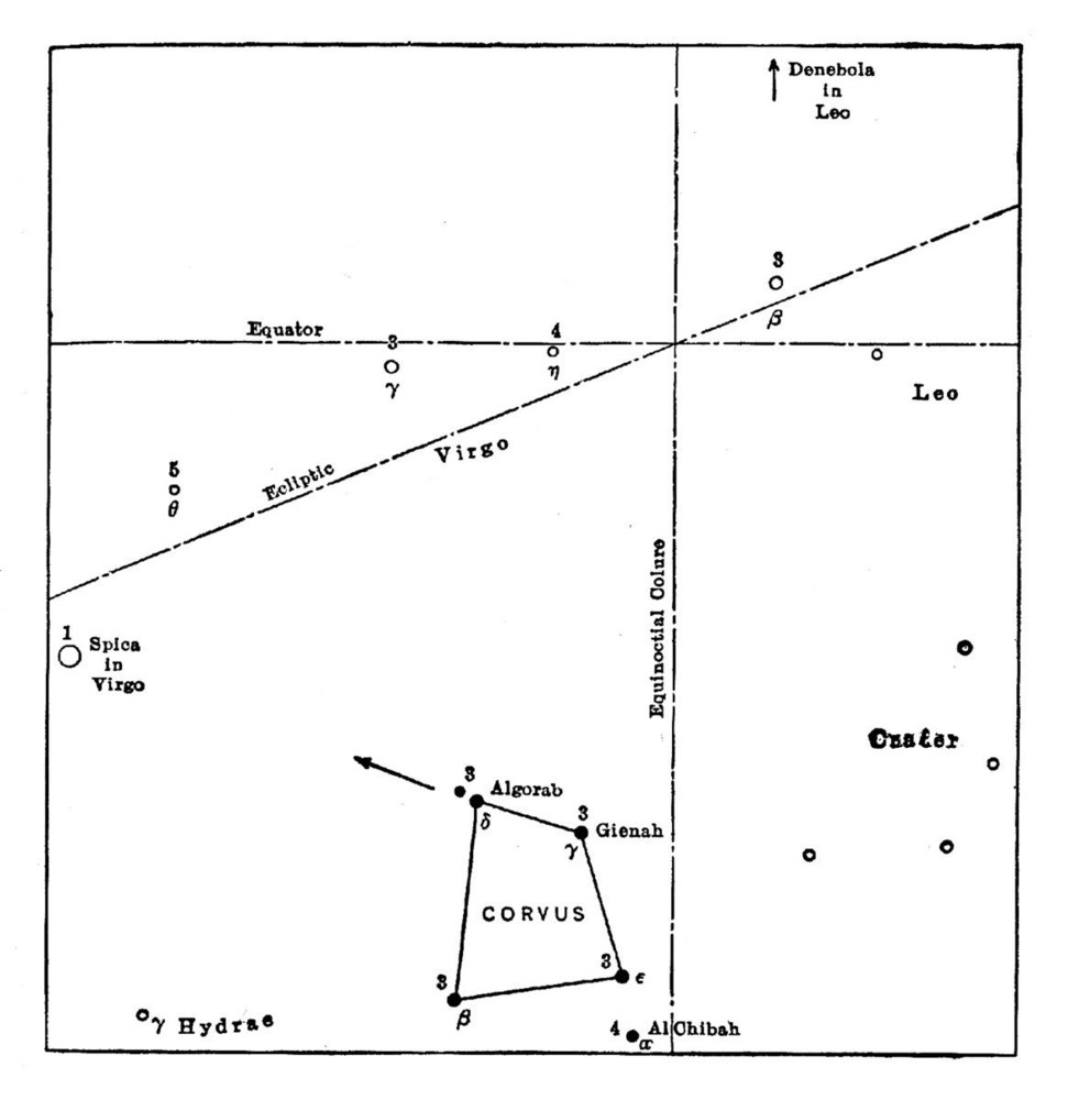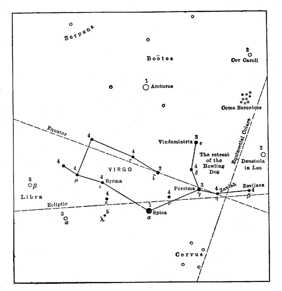 | Spica, its brightest star, is located by a line drawn from Antares in Scorpius through α in Libra and prolonged about 20°. | ||