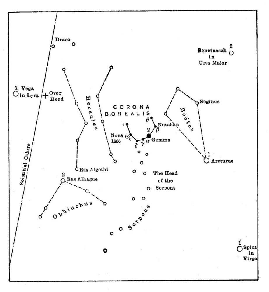 | Located by lines drawn from either Vega or Altair to Corona. | ||