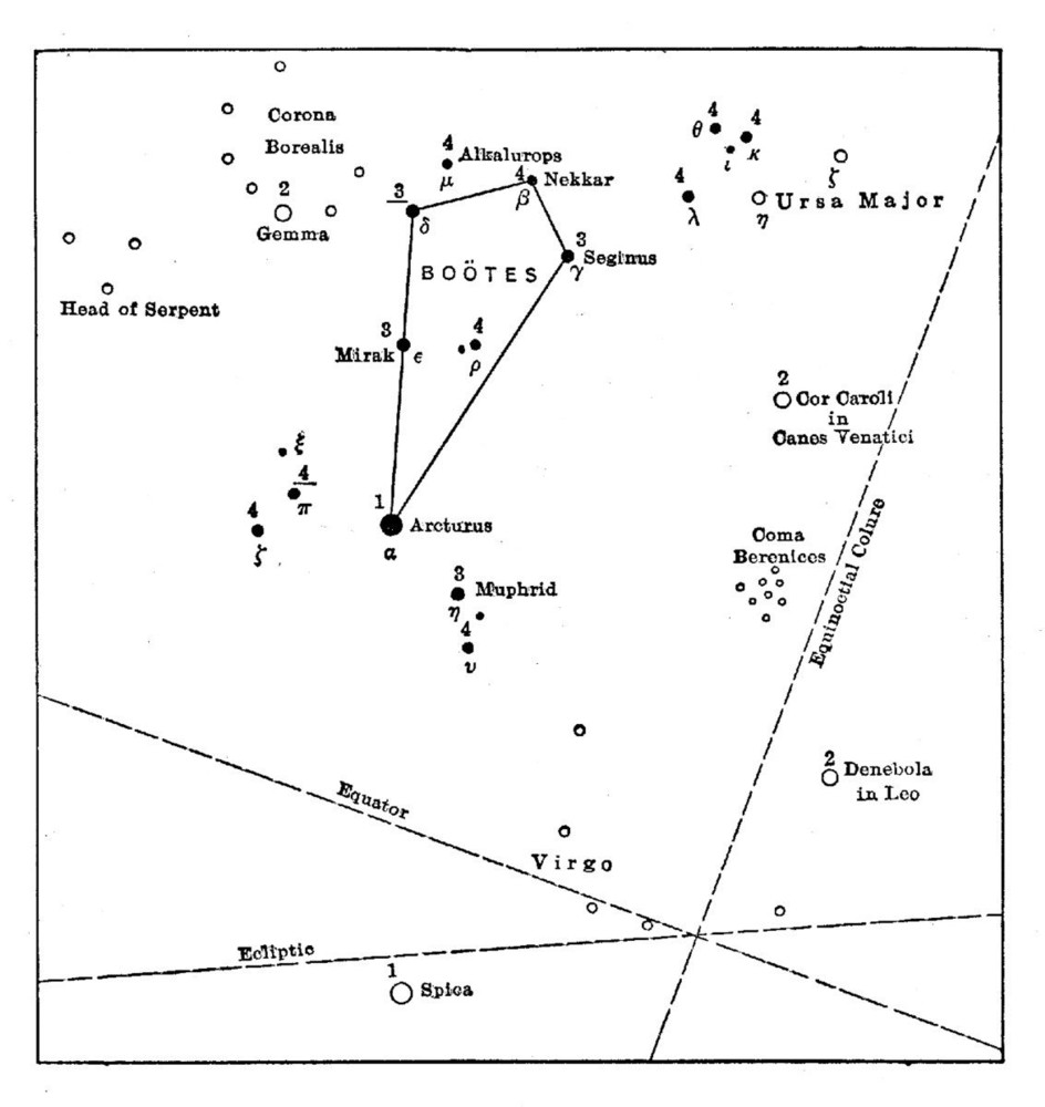 | Located just west of the Crown. Arcturus, its brightest star, is about 30° southeast of η Ursae Majoris. | ||