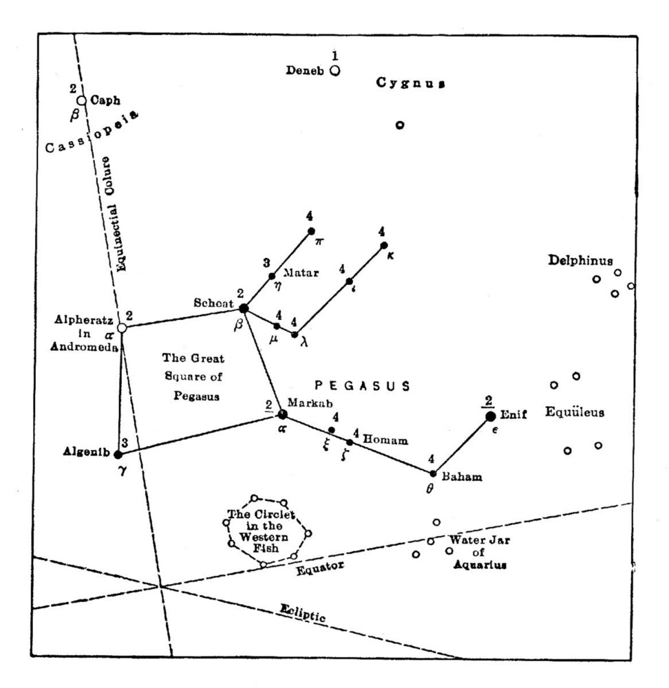| The great square of Pegasus is located by a line drawn from Polaris to Cassiopeia and prolonged. | ||