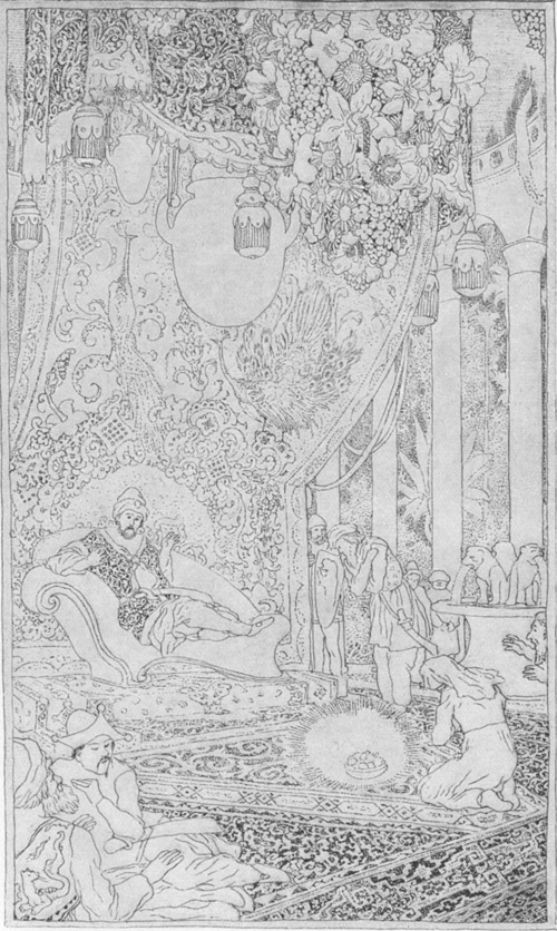 Dieser öffentliche Aufruf erweckte in Alaeddin den Wunsch, die Prinzessin entschleiert zu sehen. Er mußte sich zu diesem Behuf in das Haus eines Bekannten begeben und dort hinter ein Gitterfenster stellen; allein dies war ihm nicht genug, da die Prinzessin, dem Brauche gemäß, auf ihrem Weg ins Bad einen Schleier vor ihrem Gesichte haben mußte. Um seine Neugierde zu befriedigen, ersann er endlich ein Mittel, das ihm glückte. Er stellte sich nämlich hinter die Türe des Bades, das so eingerichtet war, daß er sie unfehlbar sehen mußte.