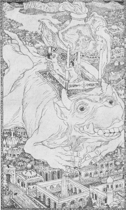 Alaeddins Mutter war nicht imstande zu antworten. Ihr Auge vermochte die abscheuliche und schreckliche Gestalt des Geistes nicht zu ertragen, und sie war gleich bei seinen ersten Worten vor Angst in Ohnmacht gefallen.