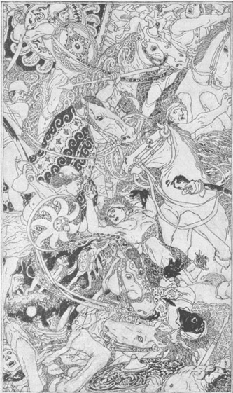 Zwei Tage blieb Alaeddin in diesem Zustande, ohne zu essen und zu trinken. Endlich am dritten, da er seinen Tod als unvermeidlich betrachtete, hob er die gefalteten Hände empor und rief mit völliger Ergebung in den Willen Gottes aus: »Es gibt keine Kraft und keine Macht, als bei Gott, dem Allerhöchsten und Größten!« Während er so die Hände gefaltet hatte, rieb er, ohne daran zu denken, an dem Ring, den ihm der Zauberer an den Finger gesteckt hatte, und dessen Kraft er noch nicht kannte. Alsbald stieg vor ihm ein Geist von ungeheurer Größe und fürchterlichem Ansehen, der mit seinem Kopf das oberste Gewölbe berührte, wie aus der Erde hervor und sprach folgende[23] Worte zu Alaeddin: »Was willst du? Ich bin bereit, dir zu gehorchen als dein Sklave und als Sklave aller derer, die den Ring am Finger haben, sowohl ich, als die andern Sklaven des Rings.«