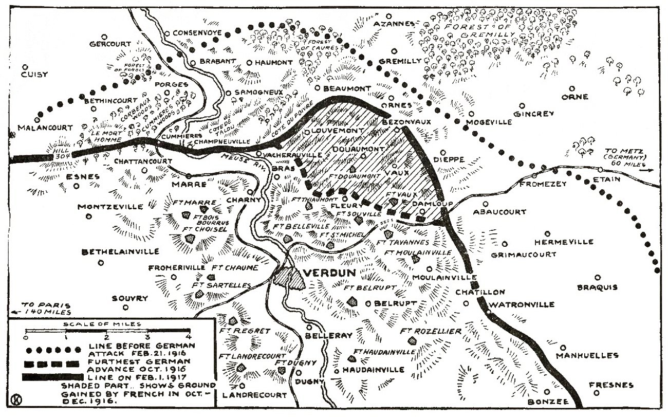 On September 6, 1916, a signal success was won by the French at Verdun when they carried the German line on the Vaux-Chapître Wood-Le Chenois front to a length of 1,000 yards, taking 250 prisoners and ten guns.