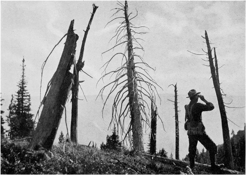 The worst of these fires were in Montana and Idaho, where the whole power of the Forest Service was used against them. The Forest Rangers, under the orders of their Supervisors, immediately organized or took charge of small companies of fire fighters, and began the work of getting them under control. But so fierce was the wind and so terrible the heat of the fires and the speed with which they moved, that in many places it became a question of saving the lives of the fire fighters rather than of putting out the fires. As a matter of fact, nearly a hundred of the men temporarily employed to [Pg 35]help the Government fire fighters lost their lives, and many more would have died but for the courage, resource, and knowledge of the woods of the Forest Rangers.
